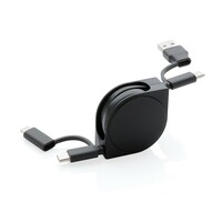 Zwijany kabel do ładowania z 4 końcówkami: USB, 2 x typu C i 2 w 1 (micro USB oraz kompatybilną z urządzeniami iOS), obudowa wykonana z ABS pochodzącego z recyklingu, posiadają certyfikat RCS (Recycled Claim Standard), który jest stosowany gdy produkt jest wykonany częściowo lub w całości z materiałów pochodzących z recyklingu, nie zawiera PVC, ślad węglowy produktu: 0,16 kg CO2