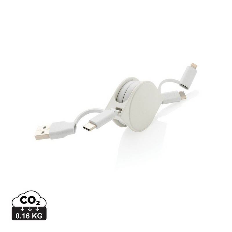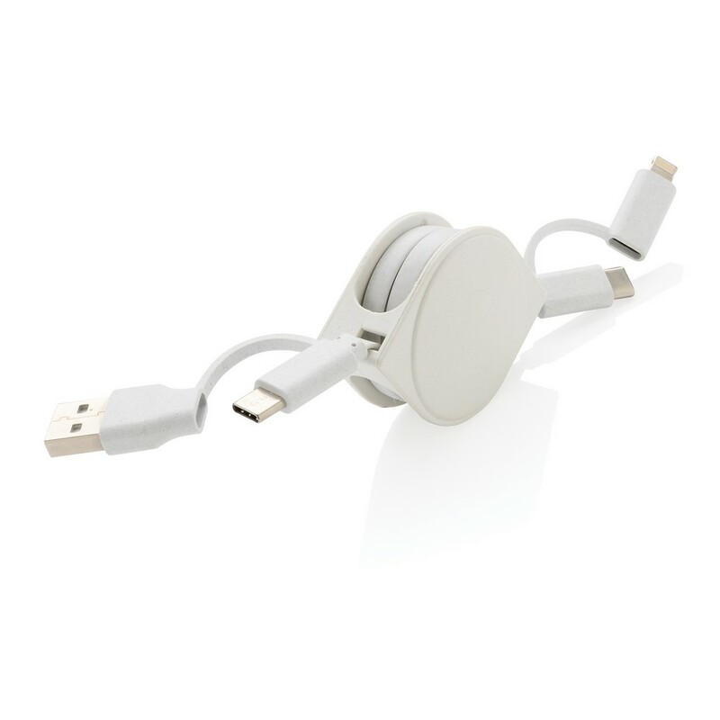 Zwijany kabel do ładowania z 4 końcówkami: USB, 2 x typu C i 2 w 1 (micro USB oraz kompatybilną z urządzeniami iOS), obudowa wykonana z ABS pochodzącego z recyklingu, posiadają certyfikat RCS (Recycled Claim Standard), który jest stosowany gdy produkt jest wykonany częściowo lub w całości z materiałów pochodzących z recyklingu, nie zawiera PVC, ślad węglowy produktu: 0,16 kg CO2