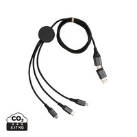 Kabel do ładowania o synchronizacji 6 w 1, kompatybilny z Android Auto (tylko końcówki USB typu C do USB typu C), wykonany z certyfikowanych materiałów pochodzących z recyklingu, całkowita zawartość materiałów z recyklingu obliczona na podstawie wagi całkowitej przedmiotu: 65%, 5 końcówek: wejście USB typu C, wejście USB-A, wyjście USB typu C, wyjście iOS, wyjście micro USB, funkcja szybkiego ładowania 18W, długość 120 cm, w pudełku kraftowym z certyfikatem FSC® mix, kabel 120cm wykonany z PET z recyklingu w komplecie