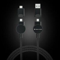 Szybki kabel do ładowania z 5 końcówkami: USB, 2x typu C i 2 w 1, micro USB, iOS, moc maksymalna ładowania USB C do USB C 45W, USB C do iOS 18W, obudowa wykonana z TPE i PET pochodzących z recyklingu, posiadają certyfikat RCS (Recycled Claim Standard), który jest stosowany gdy produkt jest wykonany częściowo lub w całości z materiałów pochodzących z recyklingu, długość 120 cm, nie zawiera PVC, ślad węglowy produktu: 0,36 kg CO2