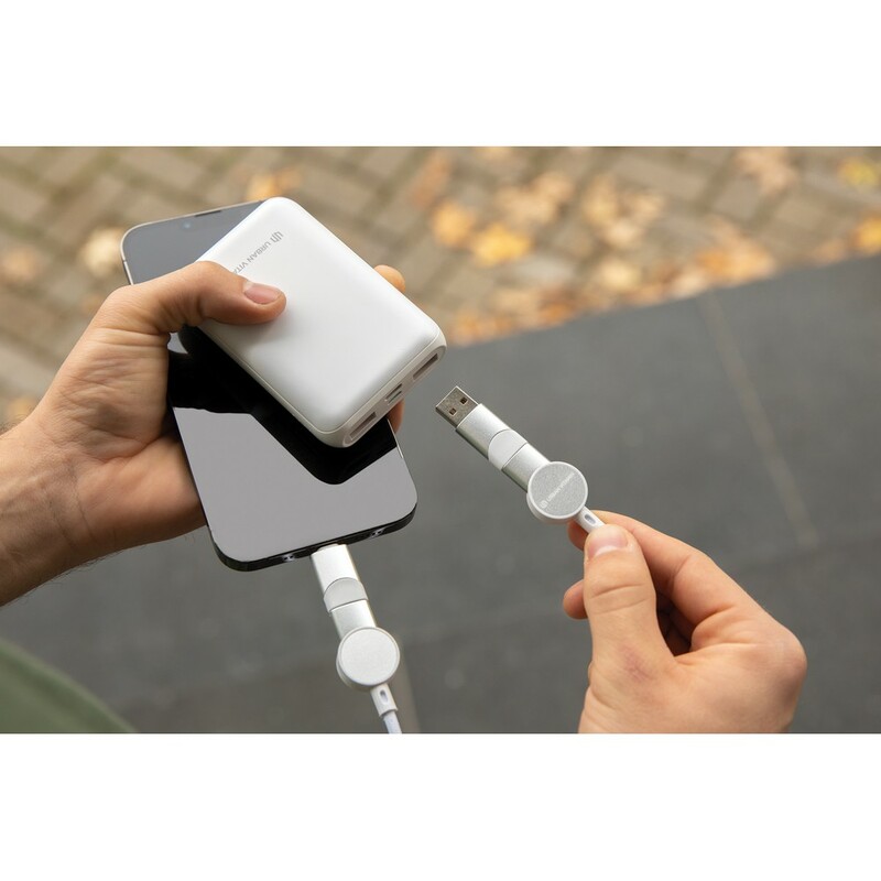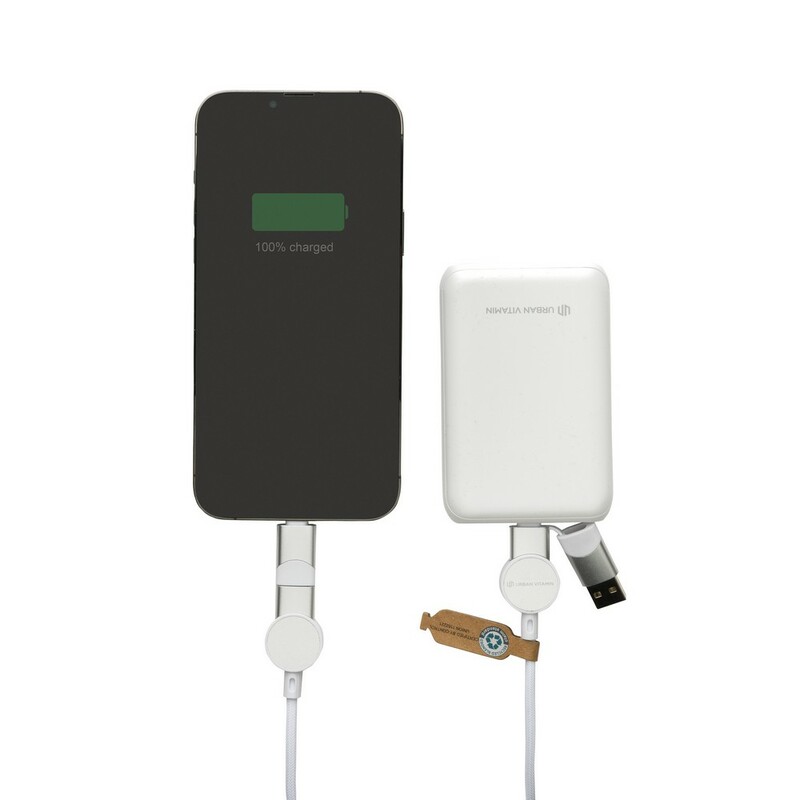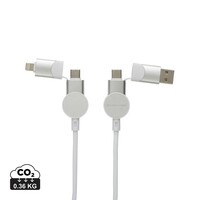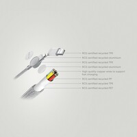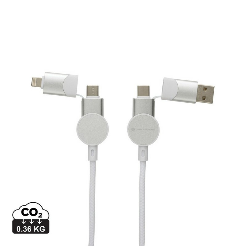 Szybki kabel do ładowania z 5 końcówkami: USB, 2x typu C i 2 w 1, micro USB, iOS, moc maksymalna ładowania USB C do USB C 45W, USB C do iOS 18W, obudowa wykonana z TPE i PET pochodzących z recyklingu, posiadają certyfikat RCS (Recycled Claim Standard), który jest stosowany gdy produkt jest wykonany częściowo lub w całości z materiałów pochodzących z recyklingu, długość 120 cm, nie zawiera PVC, ślad węglowy produktu: 0,36 kg CO2