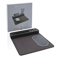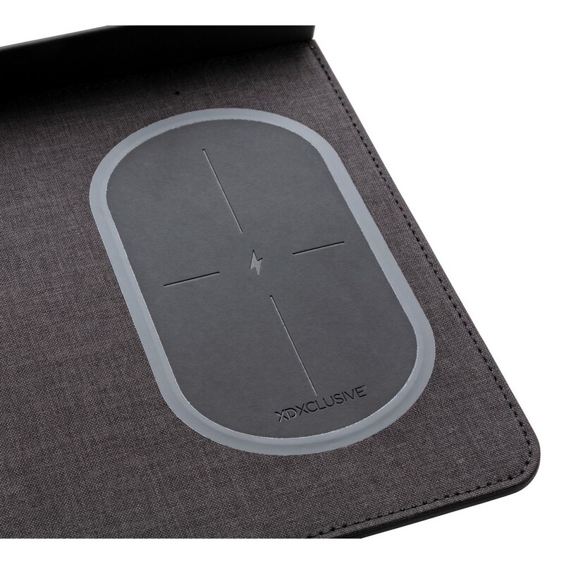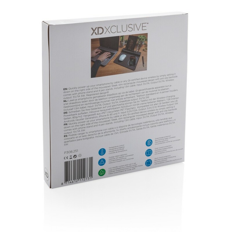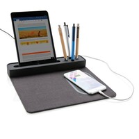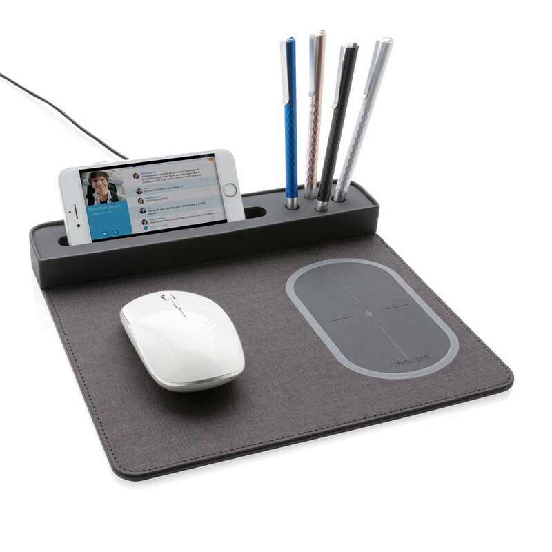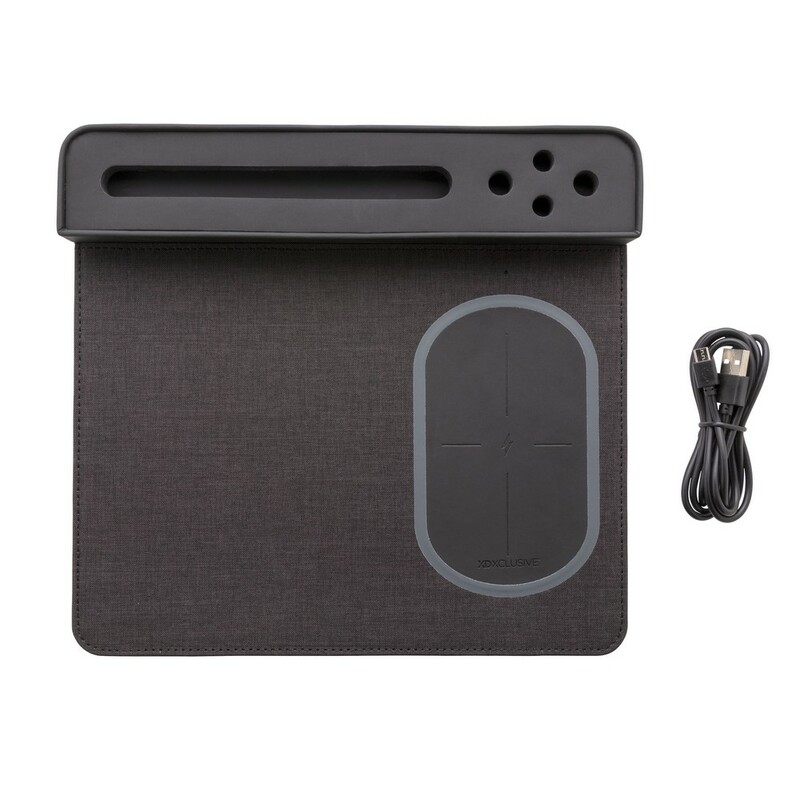 Podkładka pod mysz, ładowarka bezprzewodowa 5W, stojak na telefon, miejsce na 4 przybory do pisania, moduł ładowarki znajduje się z prawej strony podkładki, bezprzewodowe ładowanie jest kompatybilne ze wszystkimi urządzeniami posiadającymi możliwość ładowania indukcyjnego, wejście 5V/1A, wyjście 5V/1A, wyjście bezprzewodowe 5V/1A 5W, kabel 150 cm w komplecie, ślad węglowy produktu: 1,49 kg CO2