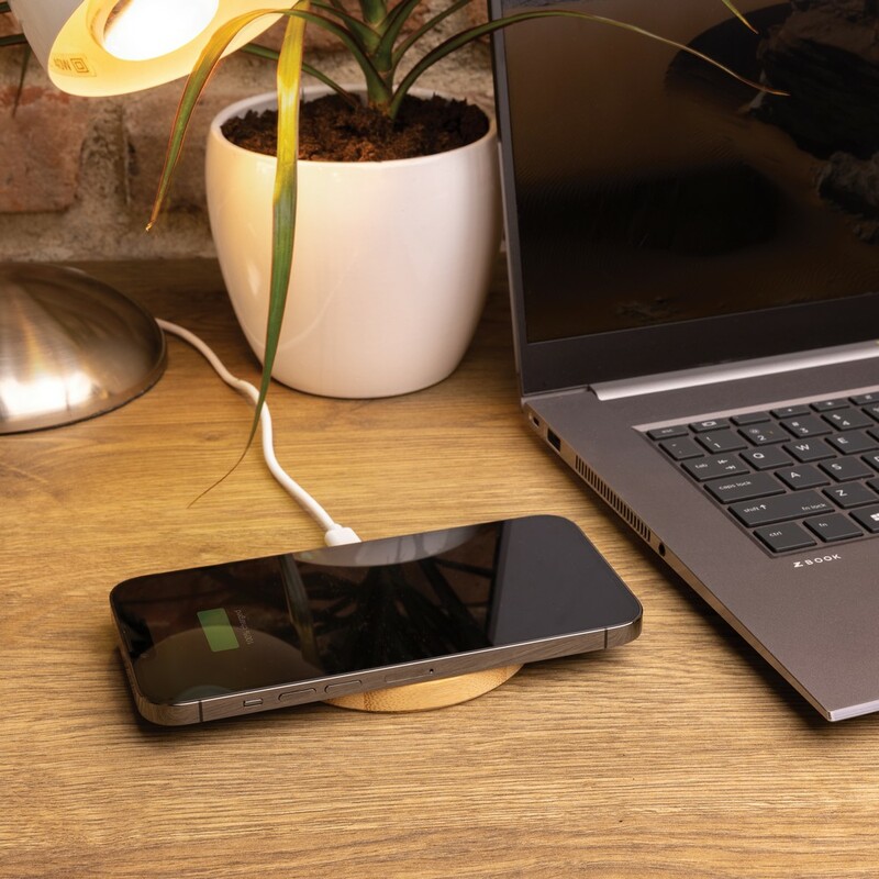 Ładowarka bezprzewodowa 15W, na zewnątrz bambus z certyfikatem FSC®, bezprzewodowe ładowanie jest kompatybilne ze wszystkimi urządzeniami posiadającymi możliwość ładowania indukcyjnego, wejście USB typu C 5-12V/1,5-2A, wyjście 15W 5-9V/1-1,67A, 150 cm kabel z TPE z recyklingu z certyfikatem RCS w komplecie, w pudełku z certyfikatem FSC® mix, ślad węglowy produktu: 0,84 kg CO2