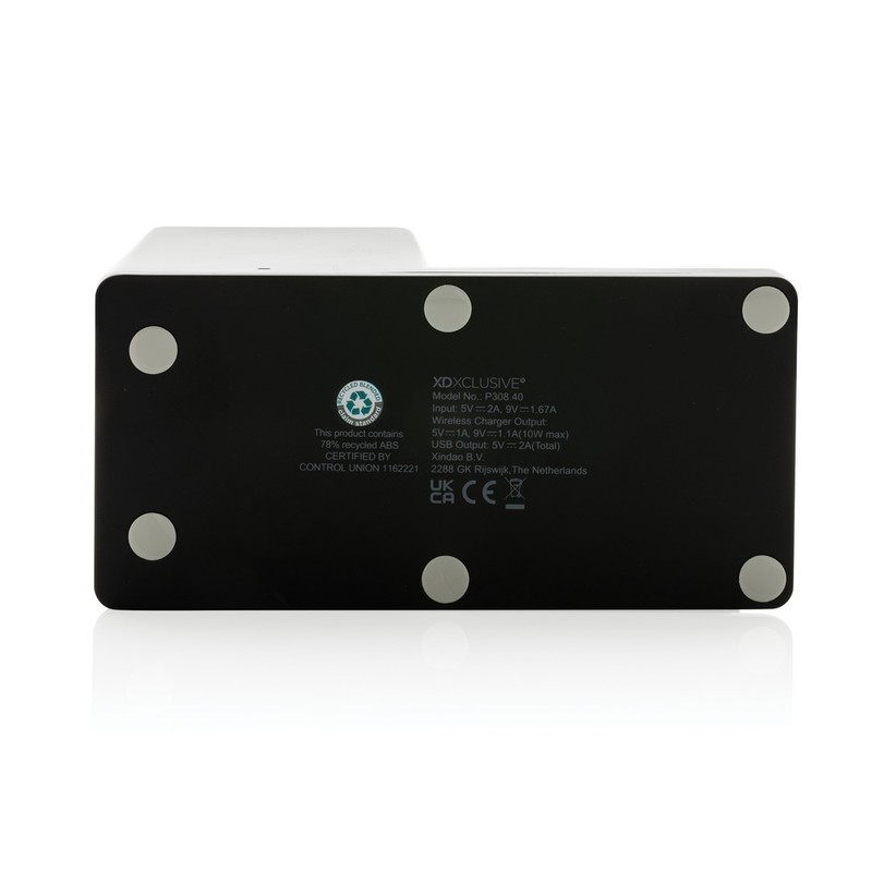 Ładowarka bezprzewodowa 10W, stojak na przybory do pisania, dwa porty USB z tyłu, wykonana z ABS z recyklingu, posiada certyfikat RCS (Recycled Claim Standard), całkowita zawartość materiału z recyklingu obliczona w oparciu o wagę całkowitą przedmiotu: 78%, panel ładowania bezprzewodowego wykonany z bambusa z certyfikatem FSC®, bezprzewodowe ładowanie jest kompatybilne ze wszystkimi urządzeniami posiadającymi możliwość ładowania indukcyjnego, funkcja szybkiego ładowania, wejście USB typu C 5V/2A, 9V/2A, wyjście bezprzewodowe 5V/1A, 9V/1,1A, kabel USB typu C 120 cm wykonany z TPE z recyklingu w komplecie, w pudełku kraftowym z certyfikatem FSC® mix, nie zawiera PVC, zarejestrowany wzór®, ślad węglowy produktu: 1,3 kg CO2