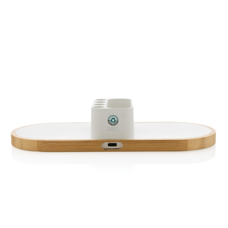 Podwójna ładowarka bezprzewodowa 10W, możliwość ładowania dwóch urządzeń jednocześnie, organizer, wykonana z materiałów pochodzących z recyklingu z certyfikatem RCS i bambusa z certyfikatem FSC®, zawartość materiałów z recyklingu obliczona na postawie wagi przedmiotu: 21%, działa z telefonami posiadającymi możliwość ładowania indukcyjnego, wejście USB typu C 5-9V/2A, wyjście 5-9V/1-1.1A, kabel w komplecie, wzór zastrzeżony®, ślad węglowy produktu: 0,93 kg CO2