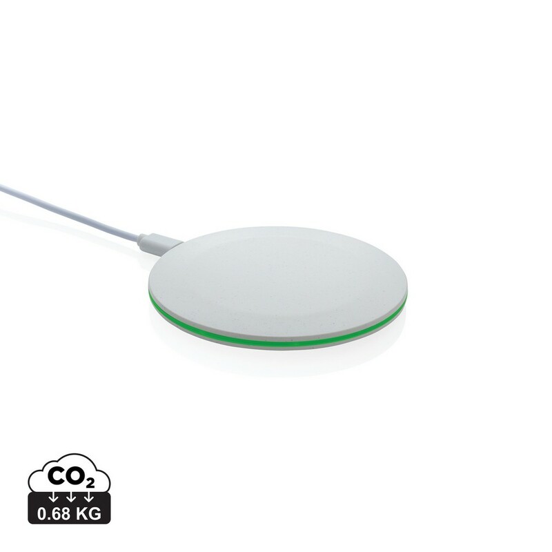 Szybka ładowarka bezprzewodowa 15W, wykonana w 66% z ABS z recyklingu z certyfikatem RCS, zawartość materiałów z recyklingu obliczona w oparciu o wagę całkowitą produktu, działa z telefonami posiadającymi możliwość ładowania indukcyjnego, wejście USB typu C 5V/2A, 9V/2A, 12V/1,5A, wyjście bezprzewodowe 5V/1A, 9V/1.1A, 9 V/1,67A 15W, 120 cm kabel USB typu C z TPE z recyklingu w komplecie, w kraftowym pudełku z certyfikatem FSC® mix, nie zawiera PVC, ślad węglowy produktu: 0,68 kg CO2