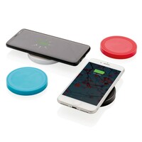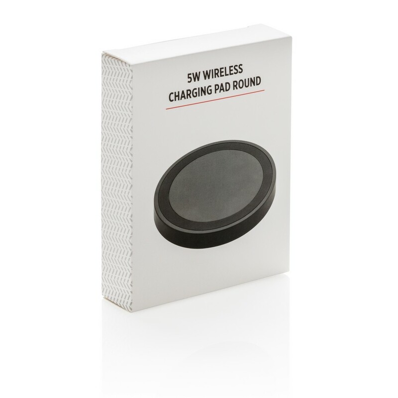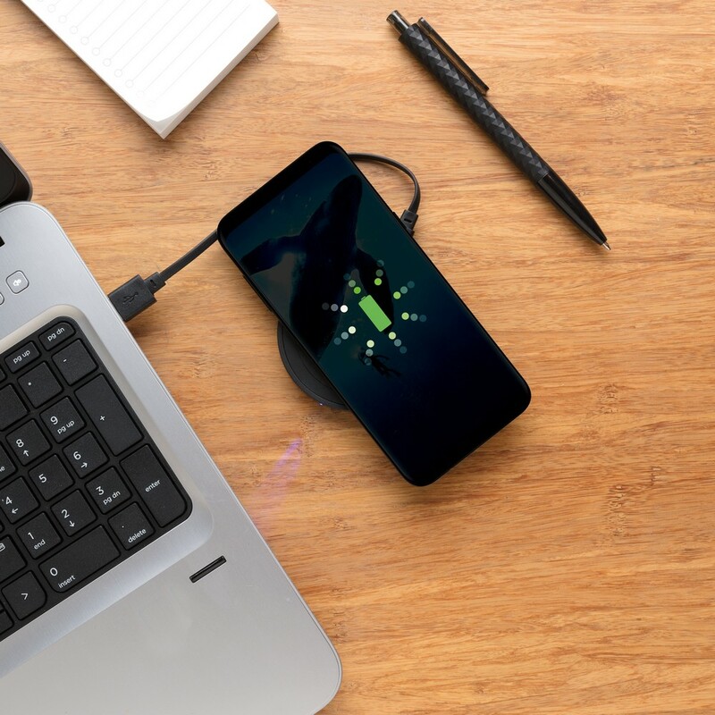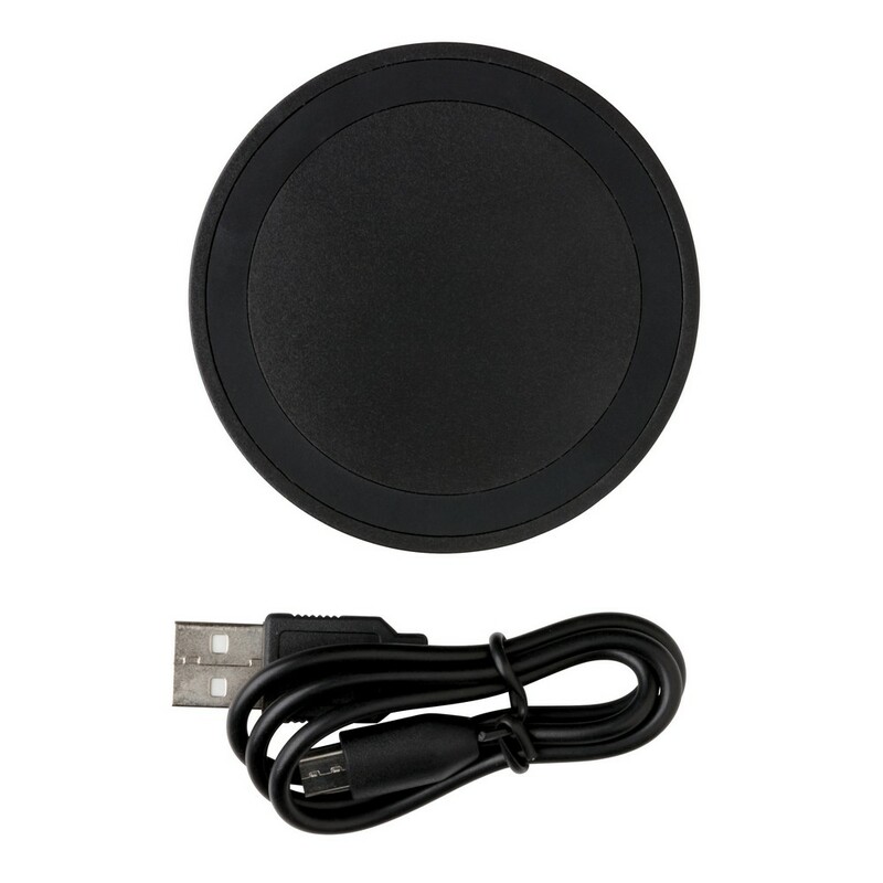 Ładowarka bezprzewodowa 5W z diodą zapalającą się podczas ładowania, silikonowy pierścień zapobiega zsuwaniu się telefonu, bezprzewodowe ładowanie jest kompatybilne ze wszystkimi urządzeniami posiadającymi możliwość ładowania indukcyjnego, wejście 5V/1.5A, wyjście bezprzewodowe 5V/1A 5W, ślad węglowy produktu: 0,78 kg CO2
