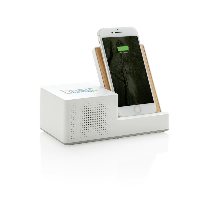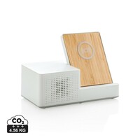 Ładowarka bezprzewodowa 5W, głośnik bezprzewodowy 3W, BT 4.1, stojak na telefon, wykonana z naturalnego bambusa i ABS, możliwość ładowania bezprzewodowo i za pomocą kabla, podczas korzystania z obu funkcji zaleca się podłączenie urządzenia do źródła zasilania, bezprzewodowe ładowanie jest kompatybilne ze wszystkimi urządzeniami posiadającymi możliwość ładowania indukcyjnego, zasięg głośnika do 10 m, 2 wyjścia USB 5V/1A max, kabel micro USB 150 cm w komplecie, wzór zastrzeżony®, ślad węglowy produktu: 4,56 kg CO2