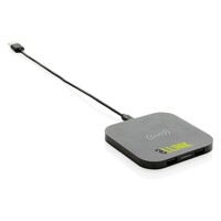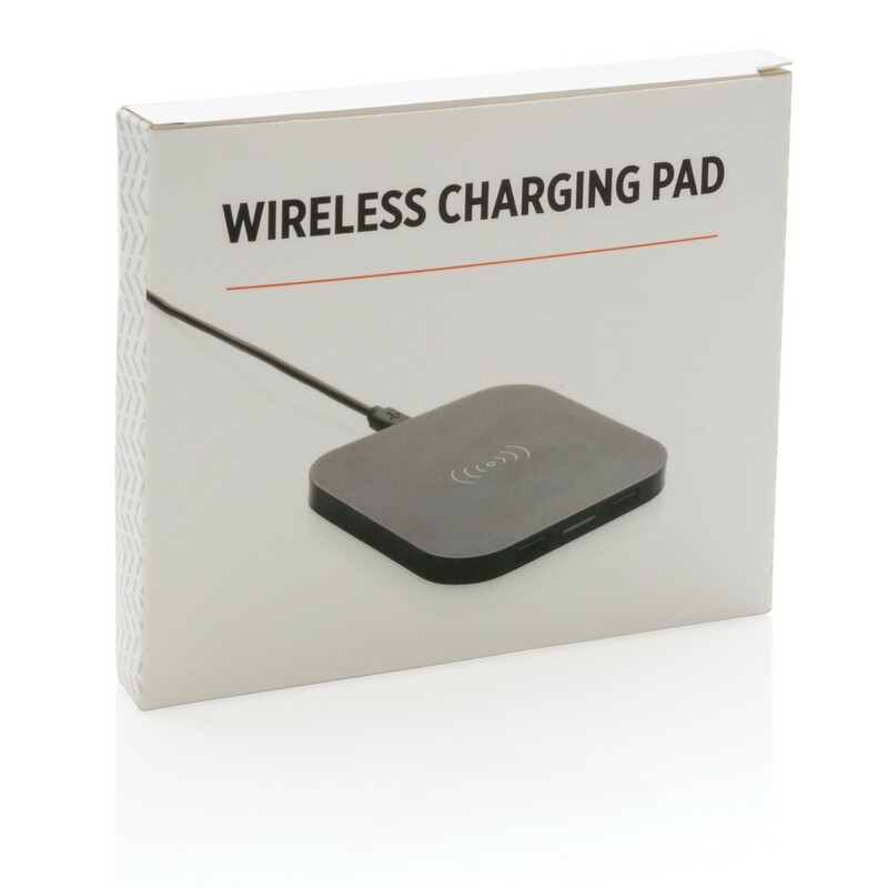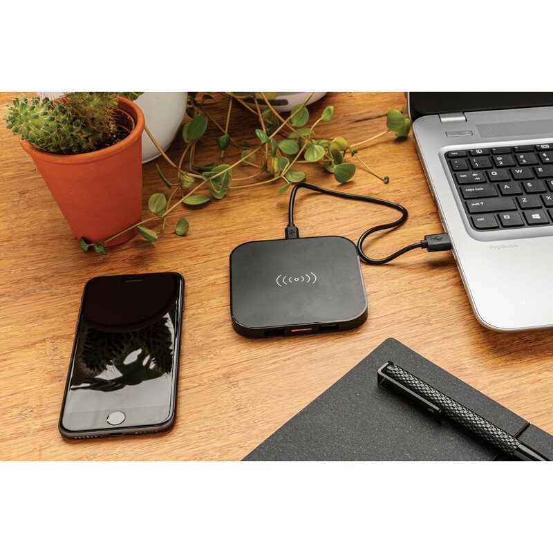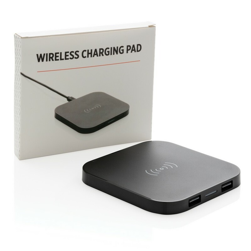 Ładowarka bezprzewodowa 5W, wykonana z ABS, dwa wyjścia USB do ładowania telefonów starszej generacji za pomocą kabla, bezprzewodowe ładowanie jest kompatybilne ze wszystkimi urządzeniami posiadającymi możliwość ładowania indukcyjnego, wejście 1A, wyjście USB 5V/1A, wyjście bezprzewodowe 5W, ślad węglowy produktu: 1,06 kg CO2