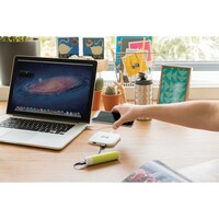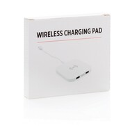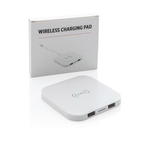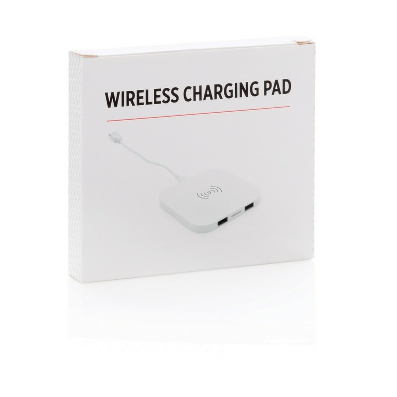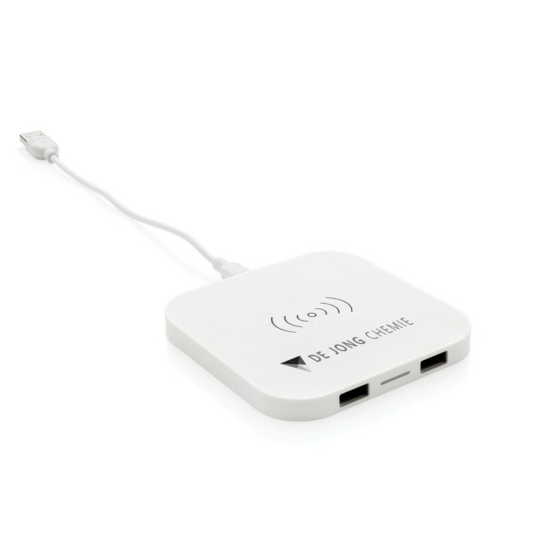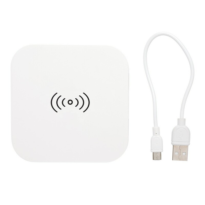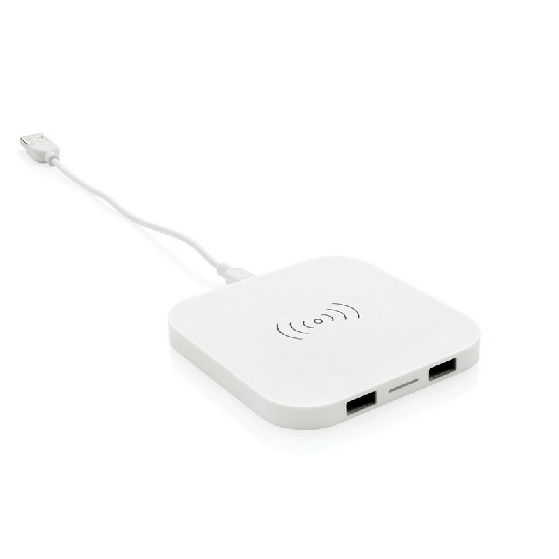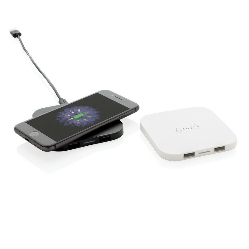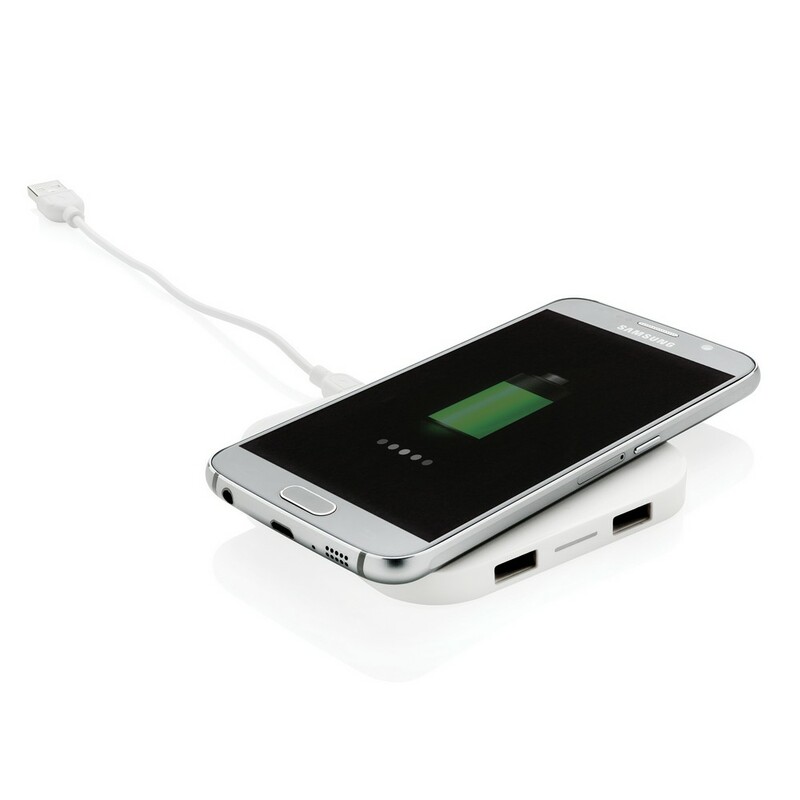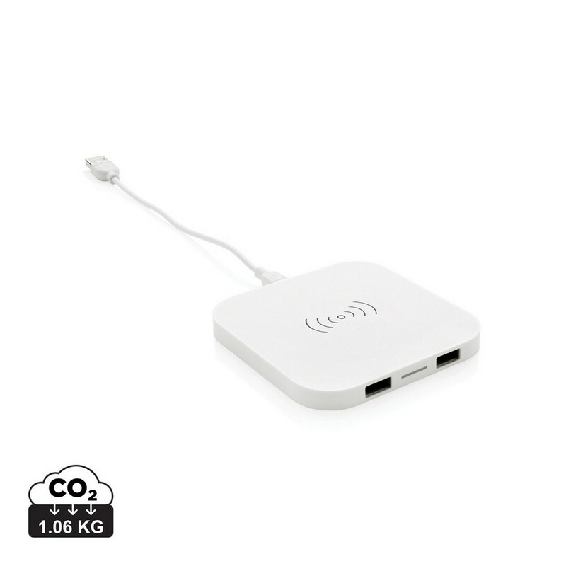 Ładowarka bezprzewodowa 5W, wykonana z ABS, dwa wyjścia USB do ładowania telefonów starszej generacji za pomocą kabla, bezprzewodowe ładowanie jest kompatybilne ze wszystkimi urządzeniami posiadającymi możliwość ładowania indukcyjnego, wejście 1A, wyjście USB 5V/1A, wyjście bezprzewodowe 5W, ślad węglowy produktu: 1,06 kg CO2