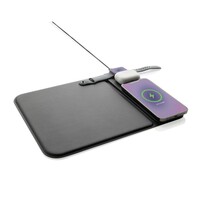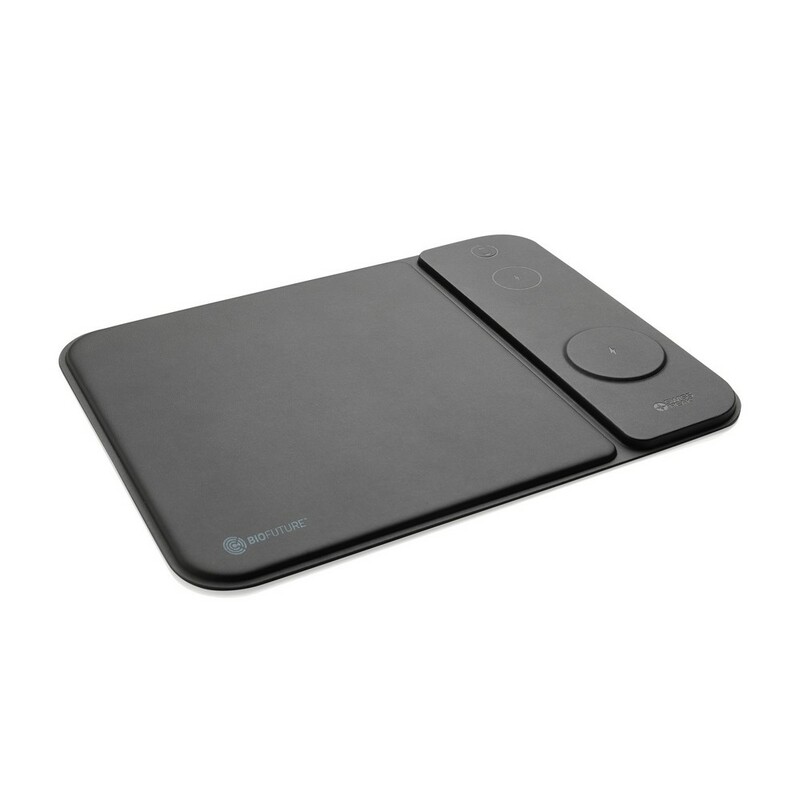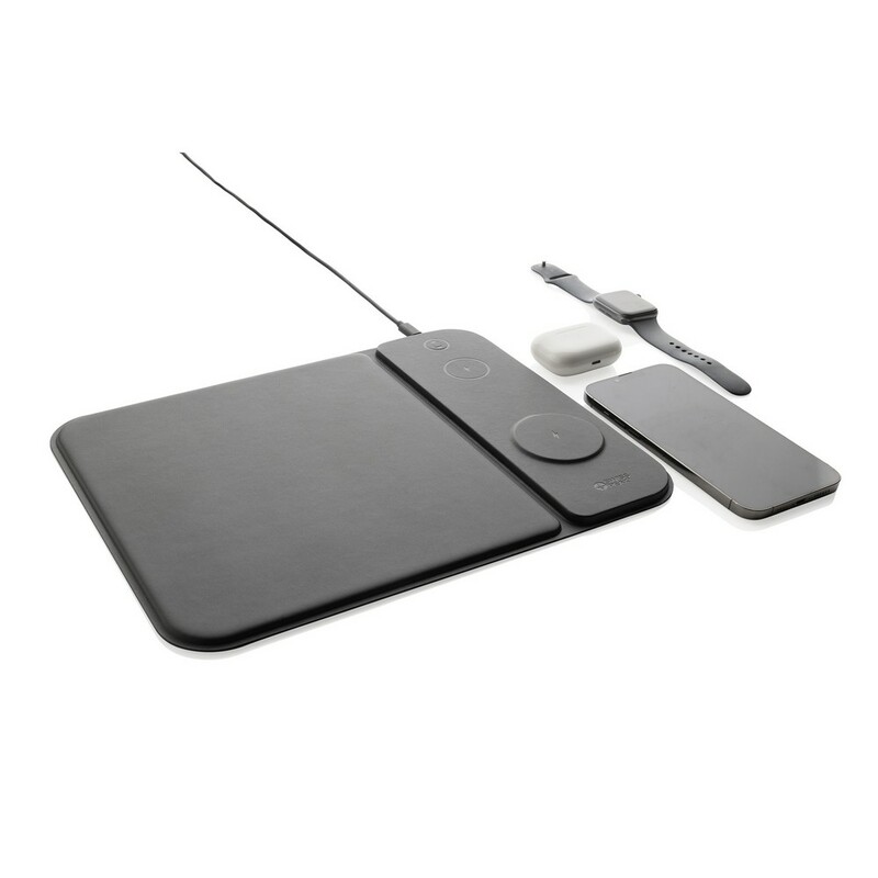 Podkładka pod mysz, ładowarka bezprzewodowa 3 w 1, magnetyczna ładowarka bezprzewodowa 15W, ładowarka bezprzewodowa 5W do słuchawek i drobnych akcesoriów, ładowarka bezprzewodowa 2,5W do smartwatchy (tylko iOS), wykonana z PU z recyklingu, działa z telefonami posiadającymi możliwość ładowania indukcyjnego, wejście 9V/3A, wyjście dla telefonu 9 V/1.1 A, 9 V/1.67 A, 15 W, wyjście dla słuchawek 5V/1A, 5W, wyjście smartwatcha 5V/0.5A, kabel 120 cm z TPE z recyklingu w komplecie, w pudełku z certyfikatem FSC®
