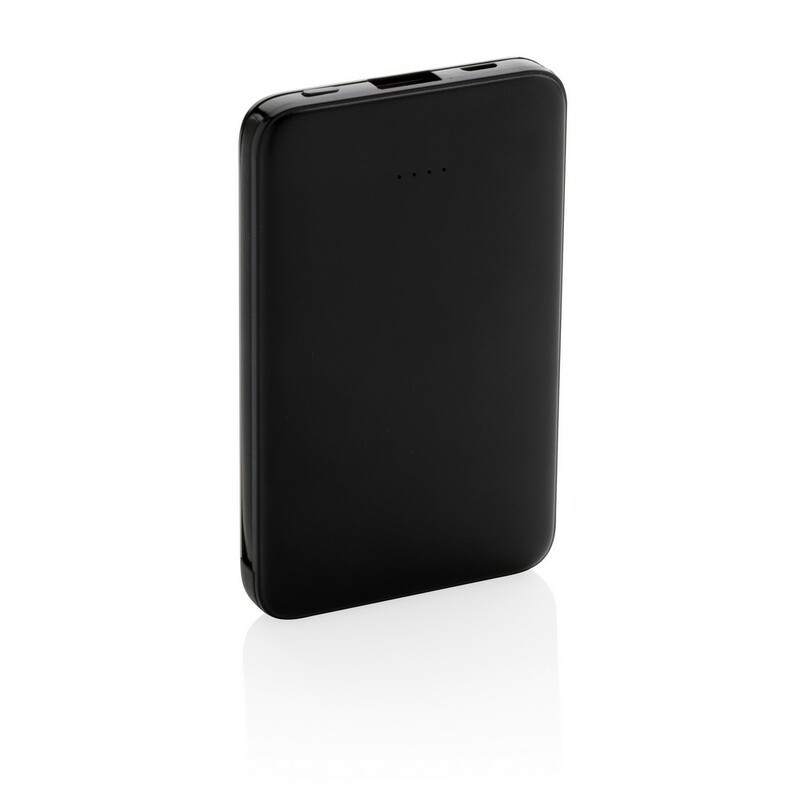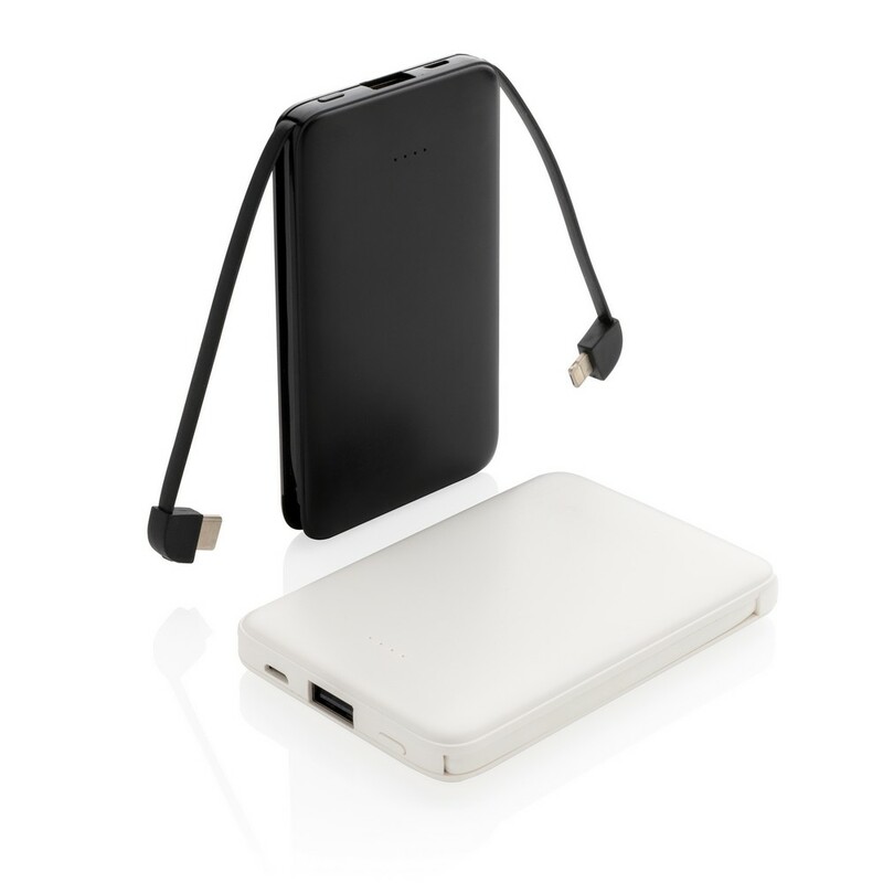 Power bank 5000 mAh, zintegrowany kabel 3 w 1 z TPE, kompatybilny z większością urządzeń dostępnych na rynku, kieszonkowy rozmiar, wykonany z ABS, wskaźniki poziomu naładowania, wbudowany akumulator litowo-polimerowy klasy A o dużej gęstości i trwałości pozwala naładować telefon do 2 razy, wejście 5V/2A, wyjście 5V/2A, ślad węglowy produktu: 1,99 kg CO2