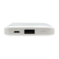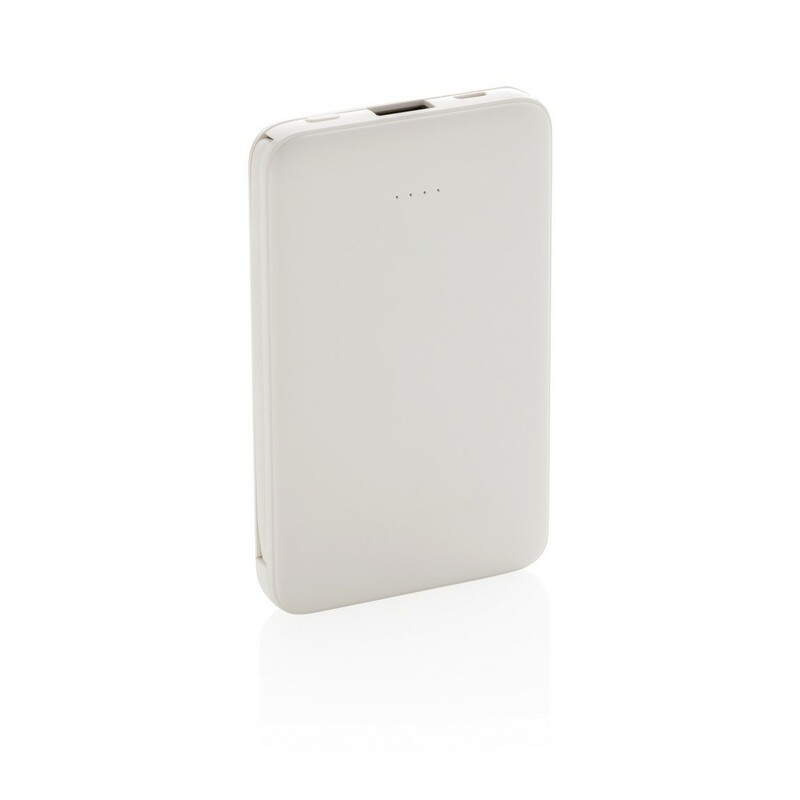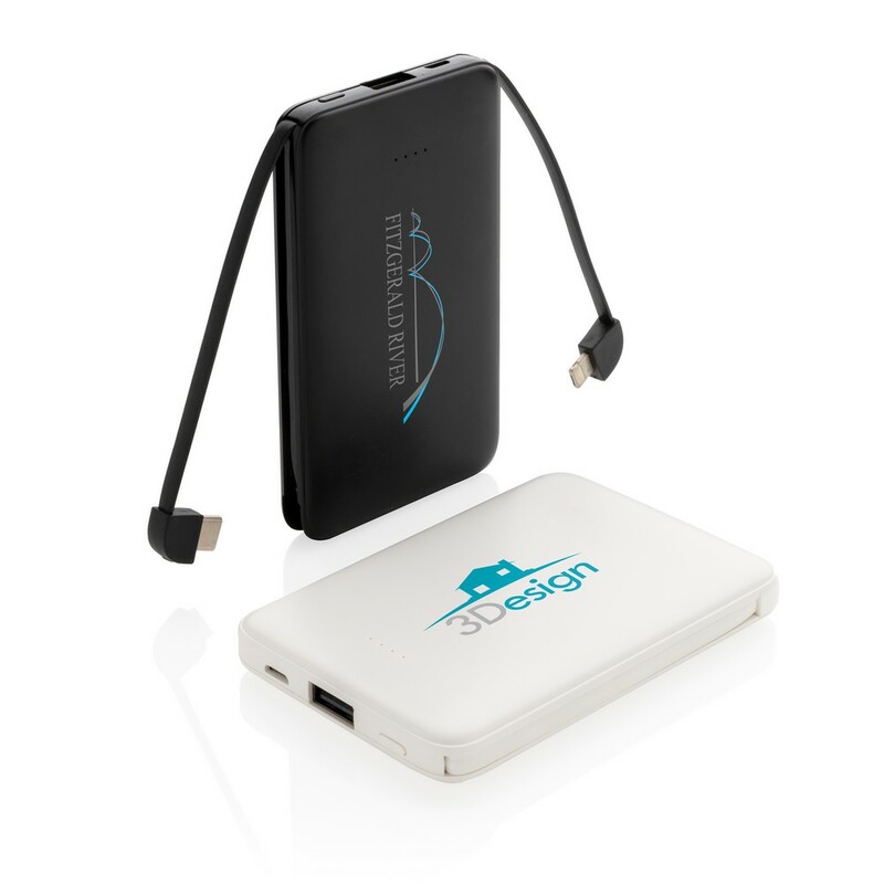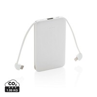 Power bank 5000 mAh, zintegrowany kabel 3 w 1 z TPE, kompatybilny z większością urządzeń dostępnych na rynku, kieszonkowy rozmiar, wykonany z ABS, wskaźniki poziomu naładowania, wbudowany akumulator litowo-polimerowy klasy A o dużej gęstości i trwałości pozwala naładować telefon do 2 razy, wejście 5V/2A, wyjście 5V/2A, ślad węglowy produktu: 1,99 kg CO2