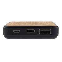 Power bank 5000 mAh, wykonany z ABS z recyklingu z certyfikatem RCS i bambusa z certyfikatem FSC®, całkowita zawartość materiałów z recyklingu: 20%, obliczona na podstawie masy całkowitej przedmiotu, wbudowany akumulator litowo polimerowy o wysokiej gęstości, wejście USB typu C 5V/2A, wejście micro USB 5V/2A, wyjście 5V/2A, w komplecie kabel z TPE z recyklingu z certyfikatem RCS®, ślad węglowy produktu: 1,94 kg CO2