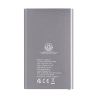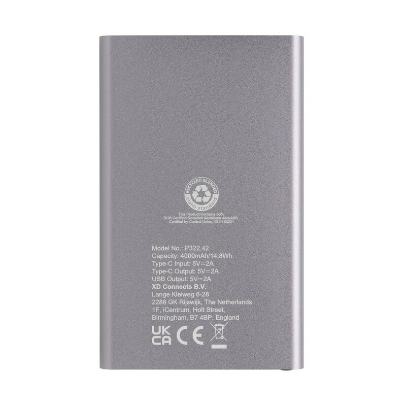 Power bank 4000 mAh, wskaźniki poziomu naładowania, wbudowany akumulator litowo-polimerowy klasy A, wykonany z aluminium i ABS z recyklingu, całkowita zawartość materiałów obliczona na podstawie wagi całkowitej przedmiotu: 66%, wejście USB typu C 5V/2A, wyjście USB typu C 5V/2A, wyjście USB 5V/2A, kabel z TPE z recyklingu z certyfikatem RCS w komplecie, w pudełku z papieru z certyfikatem FSC® mix, ślad węglowy produktu: 1,83 kg CO2