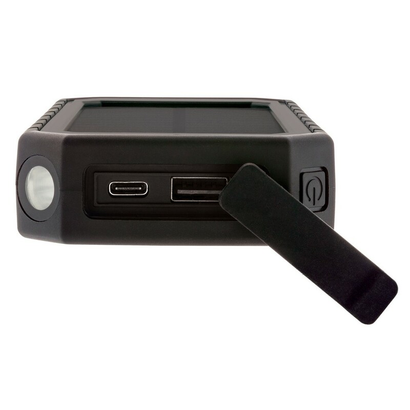 Bezprzewodowy power bank 10000 mAh ze zintegrowanym panelem słonecznym, ładowarka bezprzewodowa 10W, lampka, karabińczyk, wykonany z ABS i TPE z recyklingu, całkowita zawartość materiałów z recyklingu obliczona na podstawie wagi całkowitej produktu: 30%, wodoodporny IPX5, diody wskazujące poziom naładowania, działa z telefonami posiadającymi możliwość ładowania indukcyjnego, wyjście USB 5V/2.4A, wyjście USB typu C 5V/2.4A, kabel USB typu C z TPE z recyklingu w komplecie, nie zawiera PVC, ślad węglowy produktu: 2,13 kg CO2