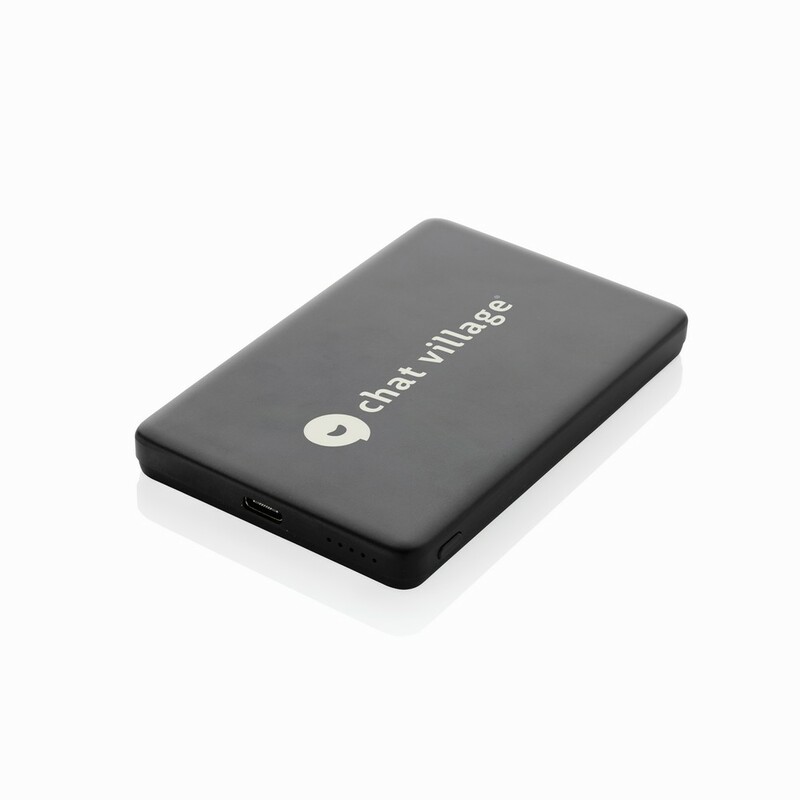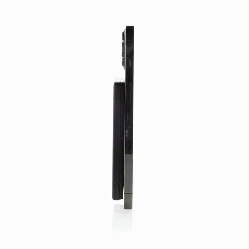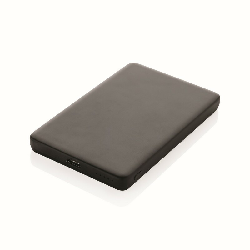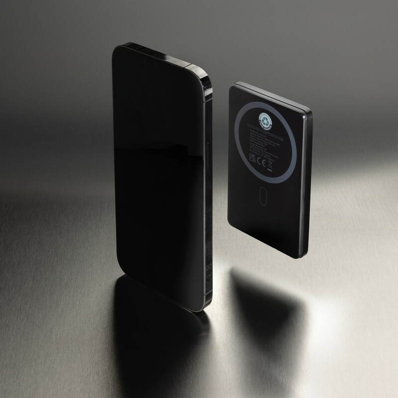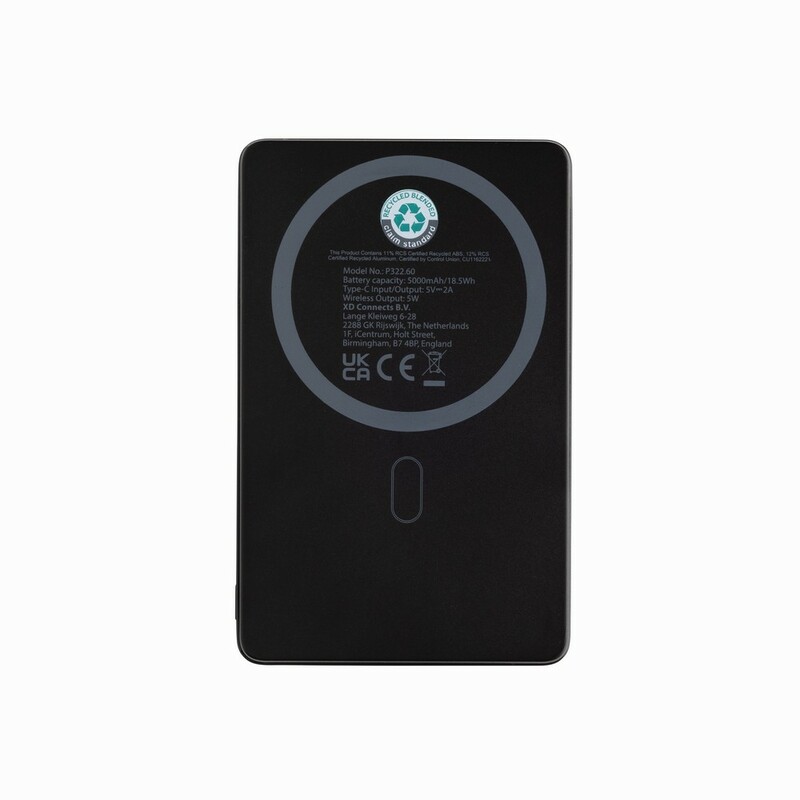 Power bank 5000 mAh, ładowarka bezprzewodowa 5W, obudowa została wykonana z aluminium pochodzącego z recyklingu z certyfikatem RCS i plastiku ABS pochodzącego z recyklingu. RCS (Recycled Claim Standard) to standard weryfikacji zawartości surowców wtórnych w produkcie w całym łańcuchu dostaw, produkt zawiera wytrzymałą baterię litowo-polimerową klasy A, wskaźniki zasilania wskazują pozostały poziom energii, wejście typu C: 5 V / 2,4 A; Wyjście USB C: 5 V / 2 A.4A, produkt i akcesoria nie zawierają PVC, zestaw zawiera kabel ładujący TPE z recyklingu z certyfikatem RCS, zapakowany w opakowanie FSC® mix
