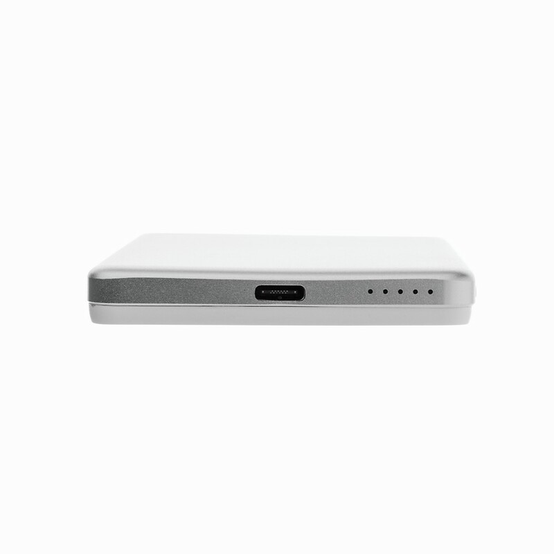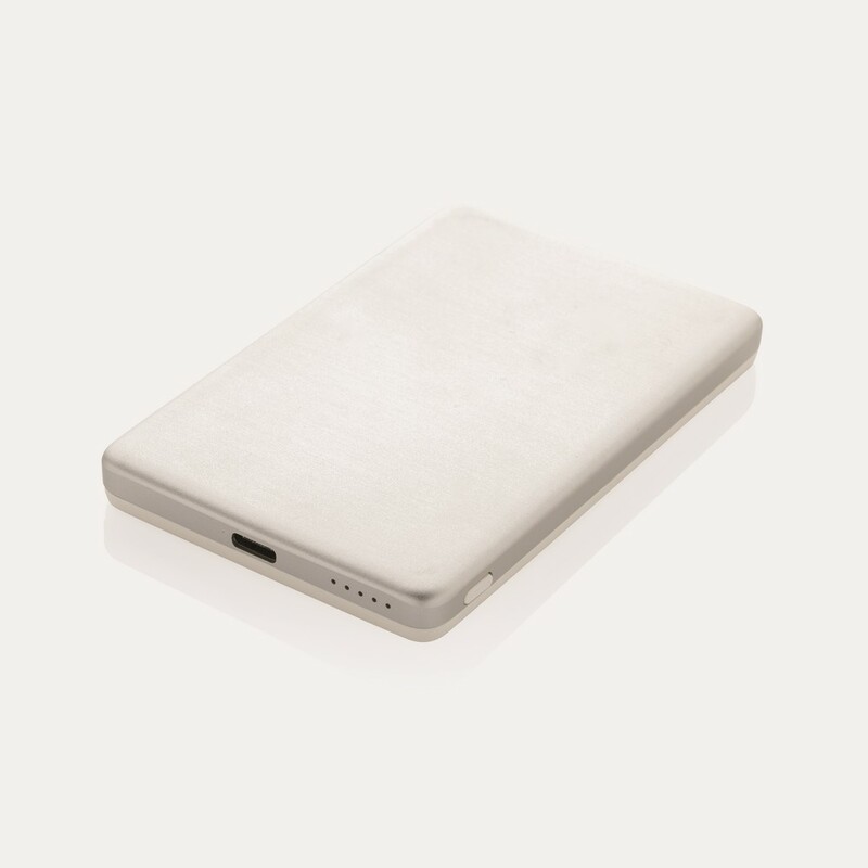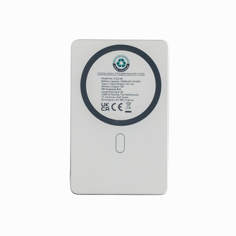 Power bank 5000 mAh, ładowarka bezprzewodowa 5W, obudowa została wykonana z aluminium pochodzącego z recyklingu z certyfikatem RCS i plastiku ABS pochodzącego z recyklingu. RCS (Recycled Claim Standard) to standard weryfikacji zawartości surowców wtórnych w produkcie w całym łańcuchu dostaw, produkt zawiera wytrzymałą baterię litowo-polimerową klasy A, wskaźniki zasilania wskazują pozostały poziom energii, wejście typu C: 5 V / 2,4 A; Wyjście USB C: 5 V / 2 A.4A, produkt i akcesoria nie zawierają PVC, zestaw zawiera kabel ładujący TPE z recyklingu z certyfikatem RCS, zapakowany w opakowanie FSC® mix