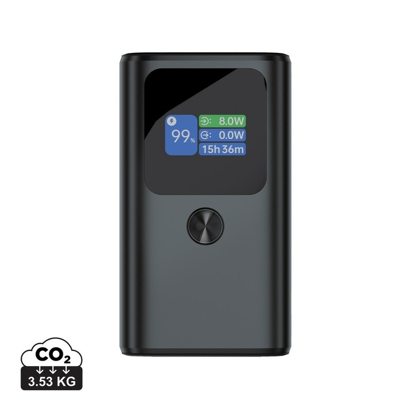 Power bank 10000 mAh, posiada kolorowy wyświetlacz TFT pokazujący poziom naładowania, prędkość ładowania, ilość cykli ładowania, stoper, moc ładowania do 55W, trzy porty wyjściowe, 2 x USB-C i USB-A, wykonany z aluminium z recyklingu
