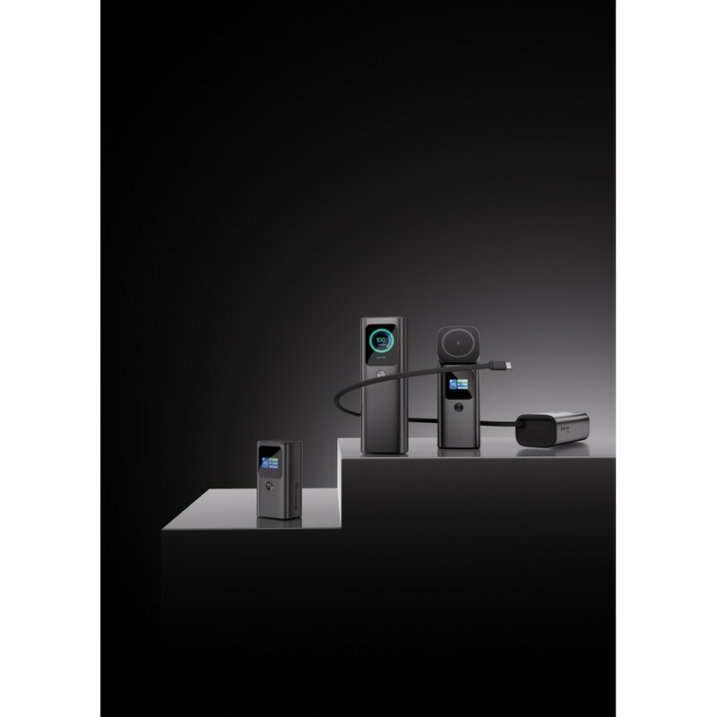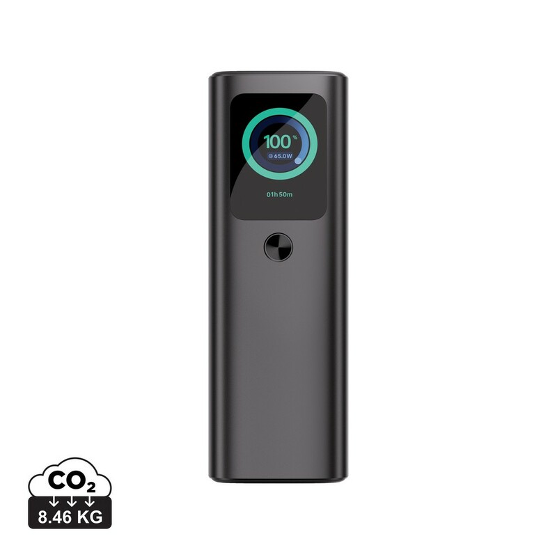 Power bank 20000 mAh, zintegrowany kabel USB-C, posiada kolorowy wyświetlacz TFT pokazujący poziom naładowania, prędkość ładowania, ilość cykli ładowania, stoper, moc ładowania do 165W, trzy porty wyjściowe, 2 x USB-C i USB-A, wykonany z aluminium z recyklingu