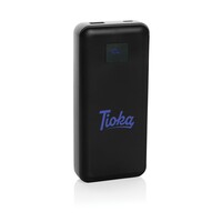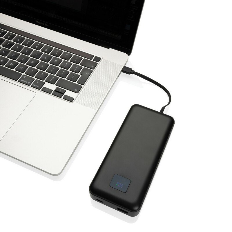 Power bank do laptopa 20000 mAh, moc ładowania przewodowego do 65W, która wystarczy do naładowania laptopa, zintegrowane kable USB C i iOS, wyświetlacz LED, wykonany z ABS z recyklingu z certyfikatem RCS, całkowita zawartość materiałów obliczona na podstawie wagi całkowitej przedmiotu: 23%, ślad węglowy produktu: 7,58 kg CO2