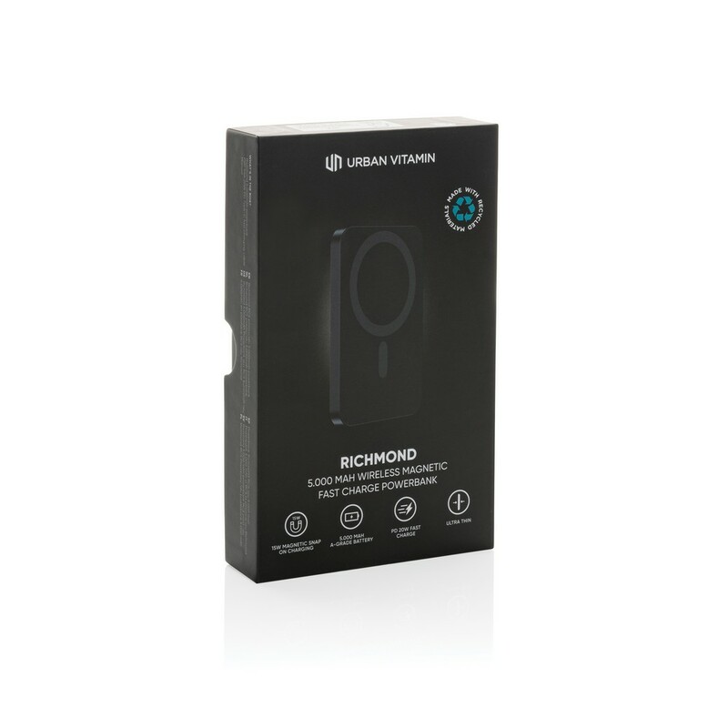 Power bank 5000 mAh, magnetyczna ładowarka bezprzewodowa 15W, szybkie ładowanie przewodowe 20W, wykonany z aluminium i ABS z recyklingu z certyfikatem RCS, wyjście USB typu C, ślad węglowy produktu: 2,63 kg CO2