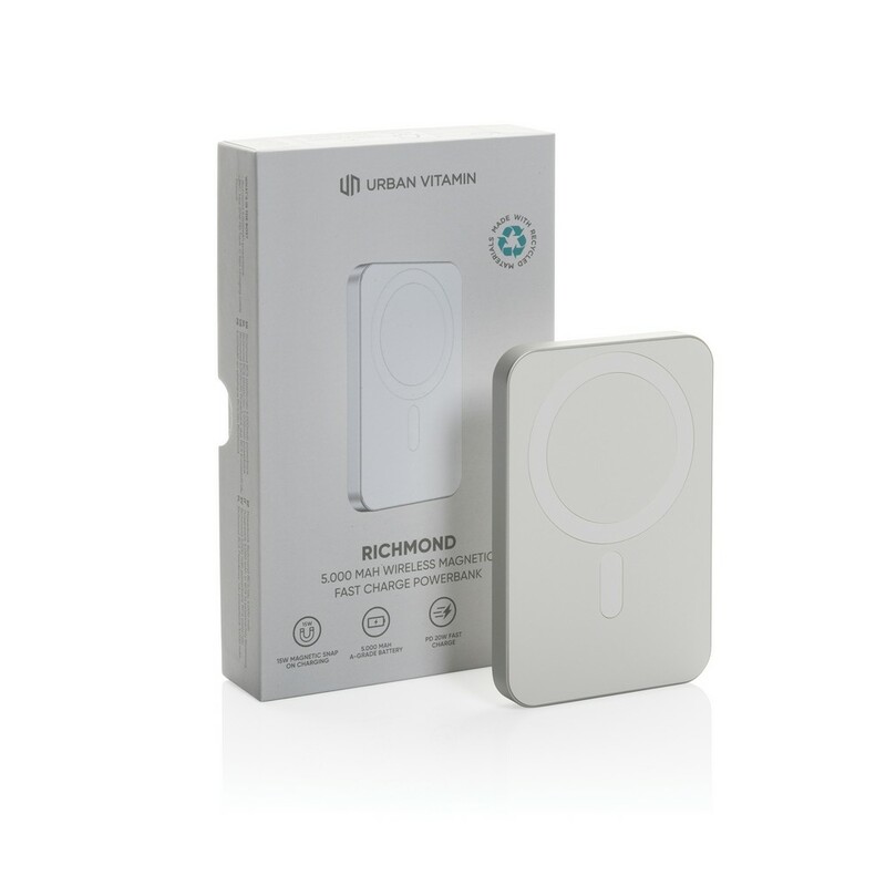 Power bank 5000 mAh, magnetyczna ładowarka bezprzewodowa 15W, szybkie ładowanie przewodowe 20W, wykonany z aluminium i ABS z recyklingu z certyfikatem RCS, wyjście USB typu C, ślad węglowy produktu: 2,63 kg CO2