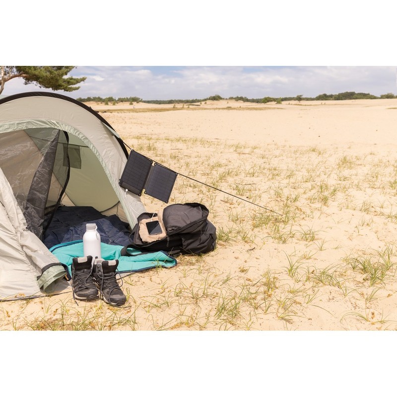 Panel słoneczny 10W, wskaźnik prędkości ładowania, stojak, wodoodporny IPX6 (całkowite zabezpieczenie przed strumieniem wody płynącej z różnych kierunków z wydajnością do 100 litrów na minutę), wyjścia USB i USB typu C (5V/1A max.), wykonany z PET i ABS z recyklingu z certyfikatem RCS, w pudełku z papieru kraftowego z certyfikatem FSC®, ślad węglowy produktu: 12,32 kg CO2