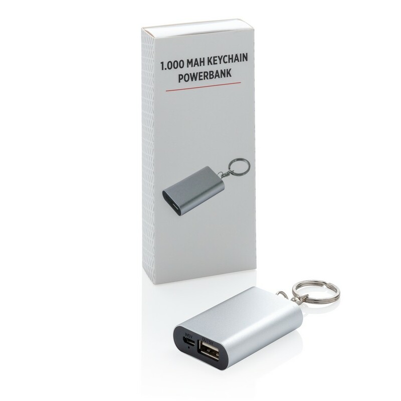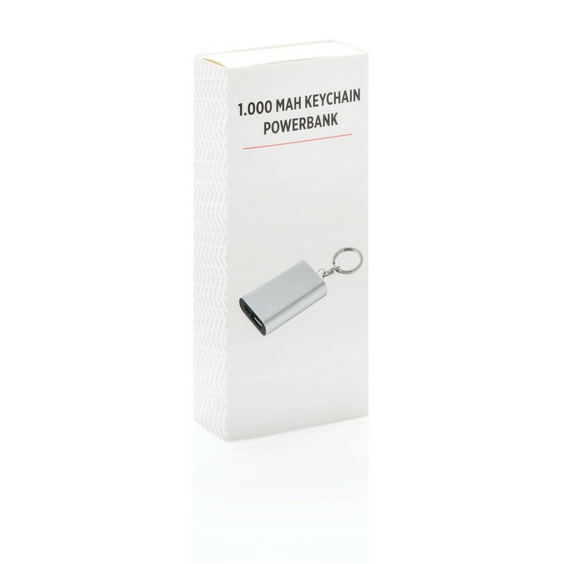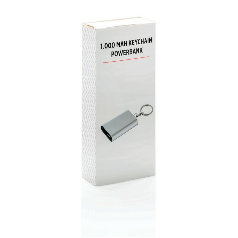 Kompaktowy power bank 1000 mAh, brelok do kluczy, lekka aluminiowa obudowa, wbudowany akumulator litowy pozwala na naładowanie telefonu do 50%, wyjście USB 5V/1A, wejście 5V/1A, kabel micro USB w komplecie, ślad węglowy produktu: 0,77 kg CO2