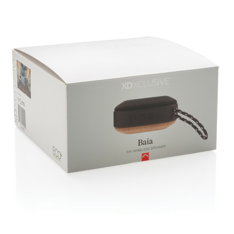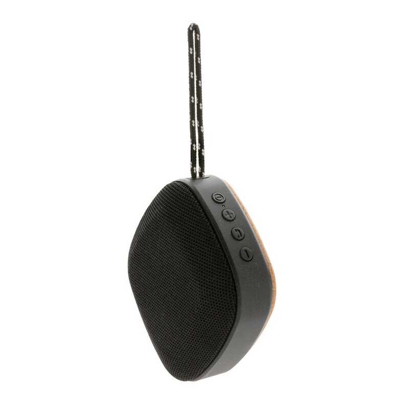 Głośnik bezprzewodowy 5W, BT 4.2, wodoodporny IPX5 (całkowita ochrona przed strumieniem wody płynącej z różnych kierunków z wydajnością do 12,5 litra na minutę), wykonany z wytrzymałej tkaniny, spód wykonany z organicznego korka, akumulator o pojemności 1000 mAh umożliwia odtwarzanie muzyki do 8 godzin, zasięg do 10 m, w trosce o środowisko naturalne opakowanie głośnika nie zawiera plastiku, wzór zastrzeżony®, ślad węglowy produktu: 2,26 kg CO2