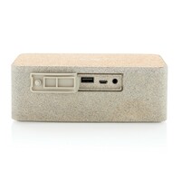 Głośnik bezprzewodowy 5W, BT 5.0, ładowarka bezprzewodowa 5W, wykonany z naturalnych włókien słomy pszenicznej, wbudowany akumulator o pojemności 1200 mAh umożliwia odtwarzanie muzyki do 4 godzin, podczas używania obu funkcji urządzenie powinno być podłączone do zasilania, bezprzewodowe ładowanie jest kompatybilne ze wszystkimi urządzeniami posiadającymi możliwość ładowania indukcyjnego, zasięg do 10 m, wejście AUX, wejście USB typu C, kabel USB typu C 150 cm komplecie