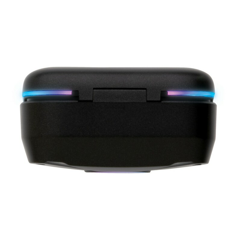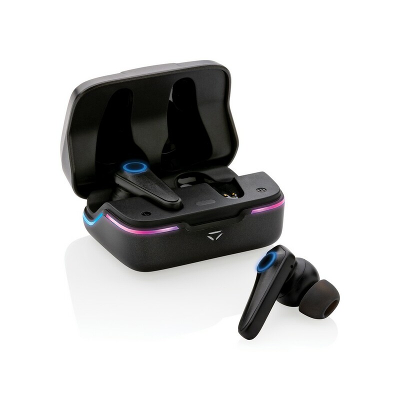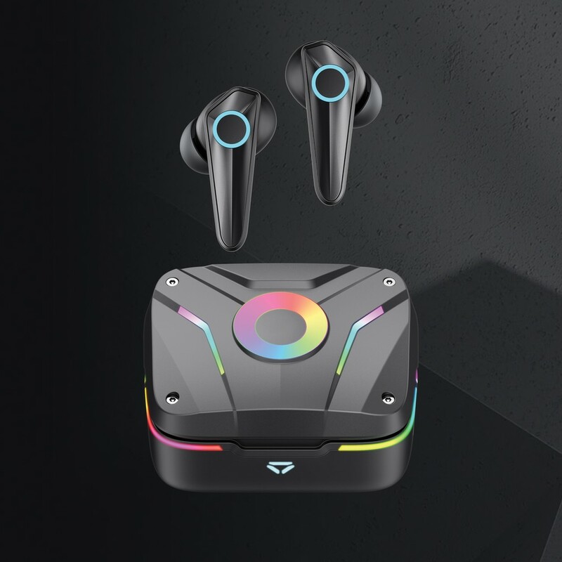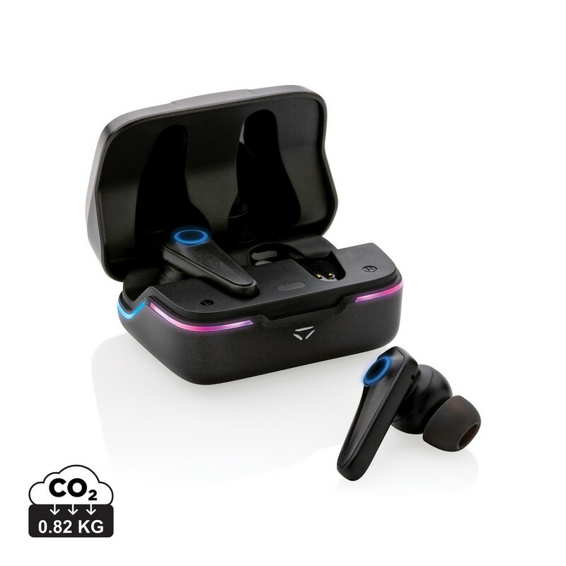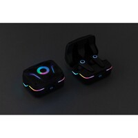 Bezprzewodowe słuchawki douszne BT 5.1 z systemem ENC (Environmental Noise Cancellation) dla krystalicznie czystych rozmów i połączeń, wbudowany mikrofon, funkcja odbierania połączeń, tryb niskich opóźnień dla graczy (60 ms), dotykowy panel sterowania, podświetlenie RGB z różnymi trybami oświetlenia, do 6 godzin odtwarzania na jednym ładowaniu, ponowne ładowanie słuchawek w 1 godzinę, etui ładującego w 2 godziny, wodoodporne IPX4 (całkowita ochrona przed spryskiwaniem i zachlapaniem wodą z różnych kierunków z natężeniem do 10 litrów na minutę), kabel oraz 3 dodatkowe nasadki w różnych rozmiarach w komplecie, nie zawiera PVC, ślad węglowy produktu: 0,82 kg CO2