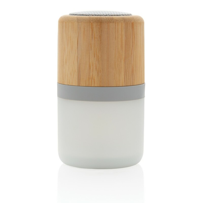 Głośnik bezprzewodowy 3W, BT 5.0, lampka, 4 tryby oświetlenia, wykonany z naturalnego bambusa, w pełni naładowany akumulator o pojemności 400 mAh umożliwia odtwarzanie muzyki do 3 godzin w zależności od używania, ponowne naładowanie w 2 godziny, kabel micro USB bez dodatku PVC w komplecie, ślad węglowy produktu: 3,04 kg CO2