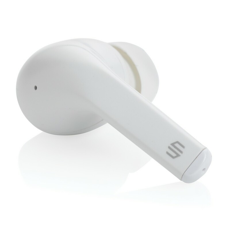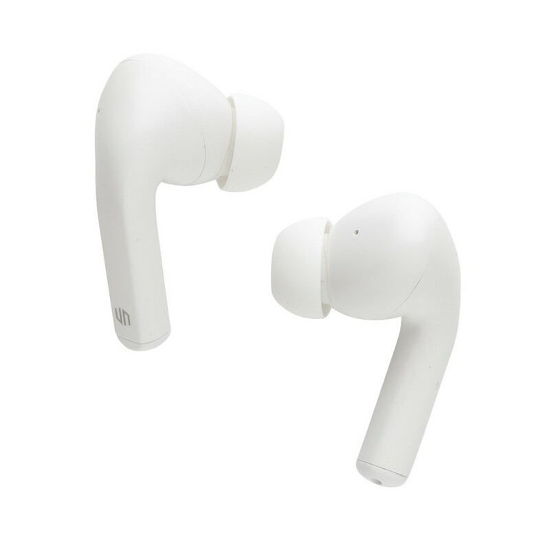 Bezprzewodowe słuchawki douszne z systemem aktywnej redukcji szumów (ANC), mocny i czysty dźwięk, poziom redukcji szumów do 25 dB, wodoodporne IPX4 (całkowita ochrona przed spryskiwaniem i zachlapaniem wodą z różnych kierunków z natężeniem do 10 litrów na minutę), dotykowy panel sterowania, wbudowany mikrofon, funkcja odbierania połączeń, do 5 godzin odtwarzania na jednym ładowaniu, etui ładujące zapewnia 20 godzin odtwarzania, nie zawiera PVC, opakowanie nie zawiera plastiku, ślad węglowy produktu: 0,98 kg CO2