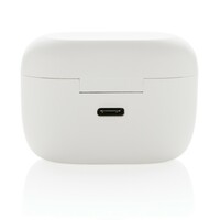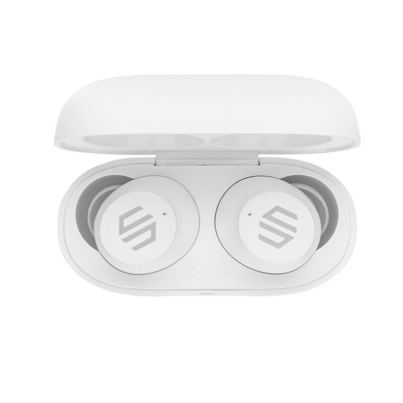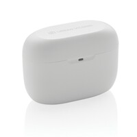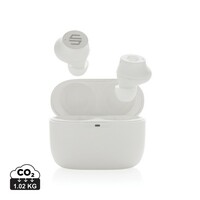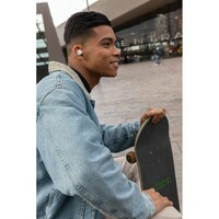 Bezprzewodowe słuchawki douszne, mocny i głęboki dźwięk, poziom redukcji szumów do 25 dB, wodoodporne IPX5 (całkowita ochrona przed strumieniem wody płynącej z różnych kierunków z wydajnością do 12,5 litra na minutę), dotykowy panel sterowania, wbudowany mikrofon, funkcja odbierania połączeń, do 5 godzin odtwarzania na jednym ładowaniu, etui ładujące zapewnia 18 godzin odtwarzania, nie zawiera PVC, opakowanie nie zawiera plastiku, ślad węglowy produktu: 1,02 kg CO2