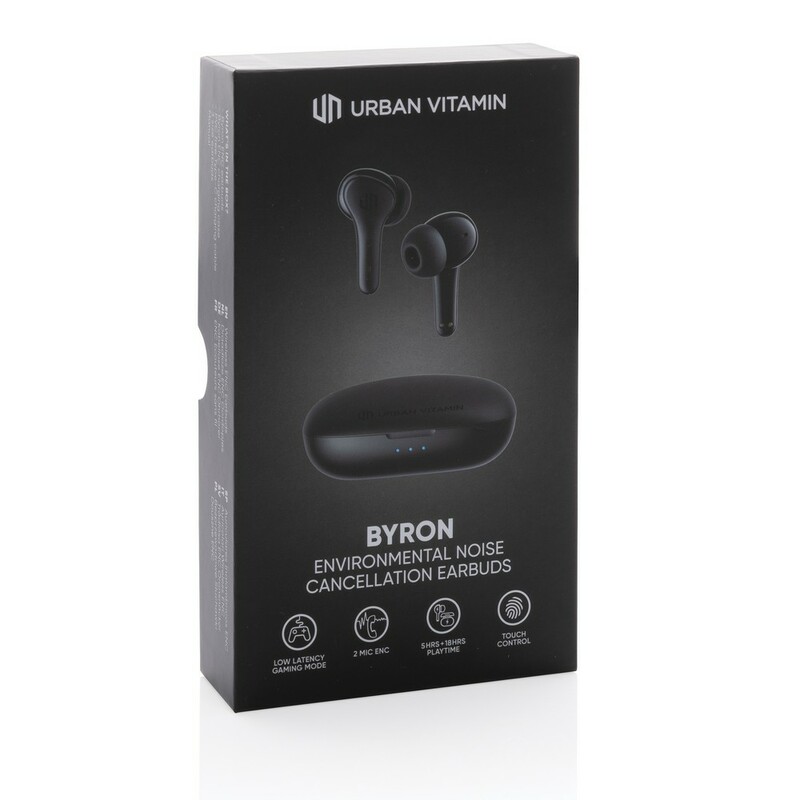 Bezprzewodowe słuchawki douszne z systemem redukcji szumów z otoczenia (ENC), który doskonale sprawdza się podczas rozmów telefonicznych, słuchawki wyposażone są w tryb niskiego opóźnienia (65 ms), dzięki któremu opóźnienie pomiędzy ekranem a dźwiękiem jest minimalizowane, wodoodporne IPX4 (całkowita ochrona przed spryskiwaniem i zachlapaniem wodą z różnych kierunków z natężeniem do 10 litrów na minutę), dotykowy panel sterowania, wbudowany mikrofon, funkcja odbierania połączeń, do 5 godzin odtwarzania na jednym ładowaniu, etui ładujące zapewnia 20 godzin odtwarzania, nie zawiera PVC, opakowanie nie zawiera plastiku, ślad węglowy produktu: 0,93 kg CO2