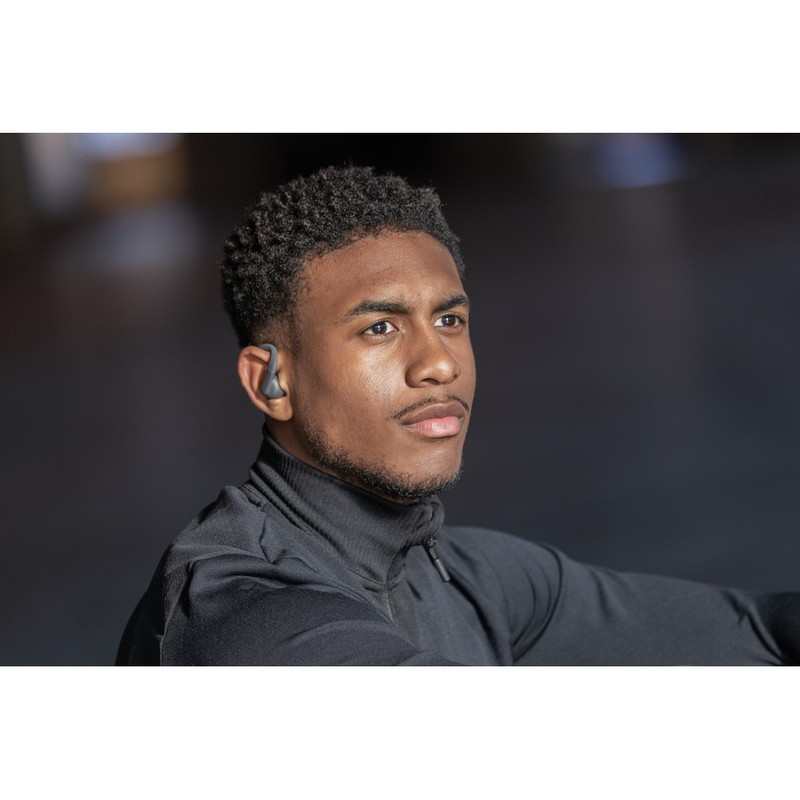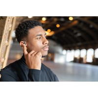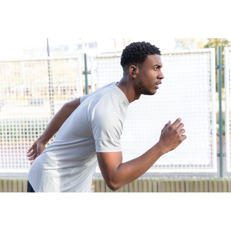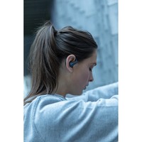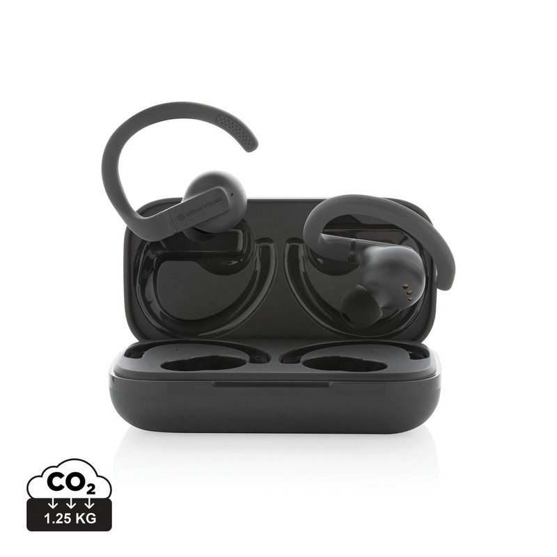 Bezprzewodowe słuchawki douszne, BT 5.3, wykonane z ABS oraz TPE z recyklingu z certyfikatem RCS, całkowita zawartość materiałów z recyklingu obliczone na podstawie wagi całkowitej przedmiotu: 55%, funkcja redukcji szumów otoczenia podczas rozmów (ENC), wodoodporne IPX5 (całkowita ochrona przed strumieniem wody płynącej z różnych kierunków z wydajnością do 12,5 litra na minutę), dotykowy panel sterowania, do 8 godzin odtwarzania na jednym ładowaniu, etui ładujące 600 mAh pozwala na trzy pełne cykle ładowania słuchawek, nie zawiera PVC, opakowanie o zmniejszonej zawartości plastiku, ślad węglowy produktu: 1,41 kg CO2
