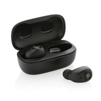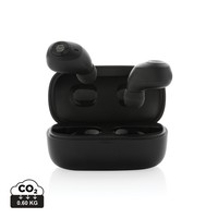 Bezprzewodowe słuchawki douszne, wykonane z ABS z recyklingu z certyfikatem RCS, całkowita zawartość materiałów z recyklingu obliczone na podstawie wagi całkowitej przedmiotu: 55%, funkcja redukcji szumów otoczenia podczas rozmów (ENC), wbudowane 2 mikrofony, funkcja odbierania połączeń, wodoodporne IPX4 (całkowita ochrona przed spryskiwaniem i zachlapaniem wodą z różnych kierunków z natężeniem do 10 litrów na minutę), dotykowy panel sterowania, do 6 godzin odtwarzania na jednym ładowaniu, etui ładujące zapewnia 20 godzin odtwarzania, nie zawiera PVC, opakowanie o zmniejszonej zawartości plastiku, ślad węglowy produktu: 0,66 kg CO2