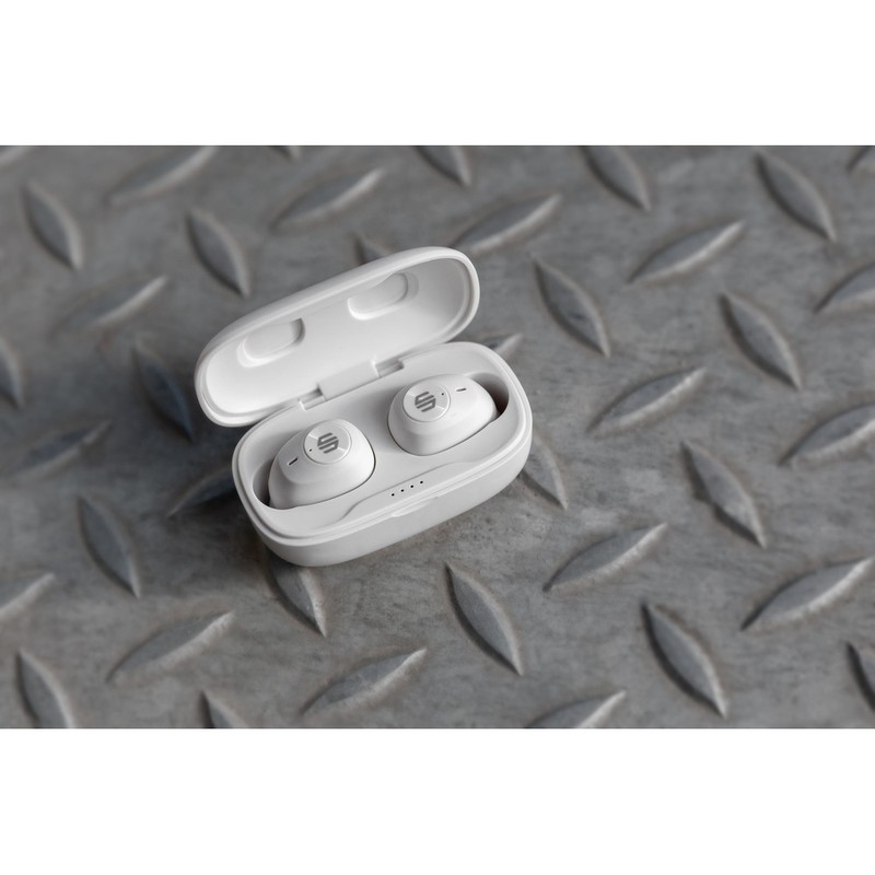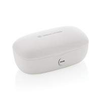 Bezprzewodowe słuchawki douszne, wykonane z ABS z recyklingu z certyfikatem RCS, całkowita zawartość materiałów z recyklingu obliczone na podstawie wagi całkowitej przedmiotu: 55%, funkcja redukcji szumów otoczenia podczas rozmów (ENC), wbudowane 2 mikrofony, funkcja odbierania połączeń, wodoodporne IPX4 (całkowita ochrona przed spryskiwaniem i zachlapaniem wodą z różnych kierunków z natężeniem do 10 litrów na minutę), dotykowy panel sterowania, do 6 godzin odtwarzania na jednym ładowaniu, etui ładujące zapewnia 20 godzin odtwarzania, nie zawiera PVC, opakowanie o zmniejszonej zawartości plastiku, ślad węglowy produktu: 0,66 kg CO2