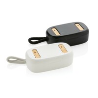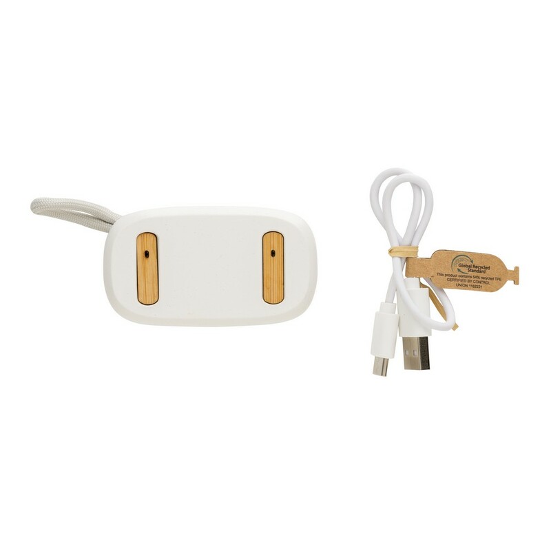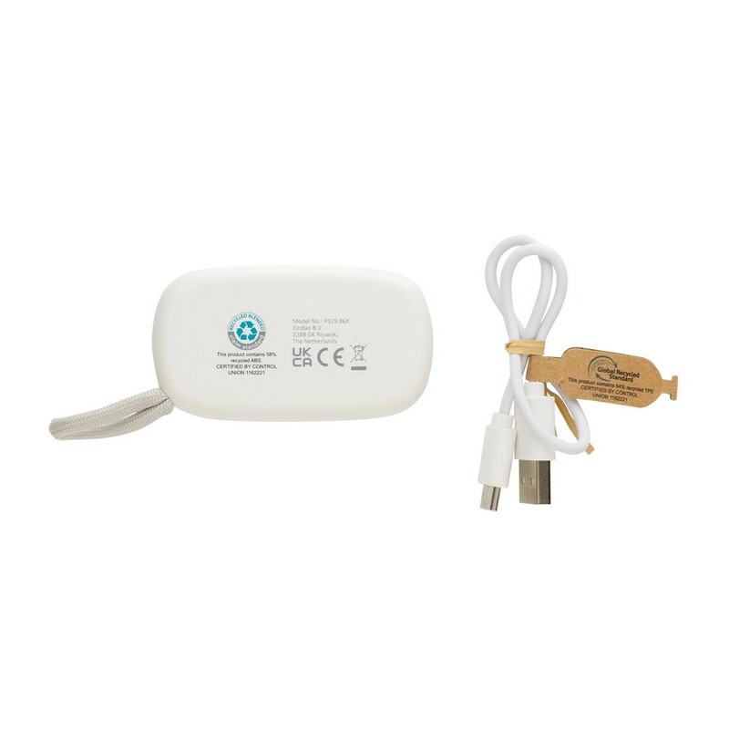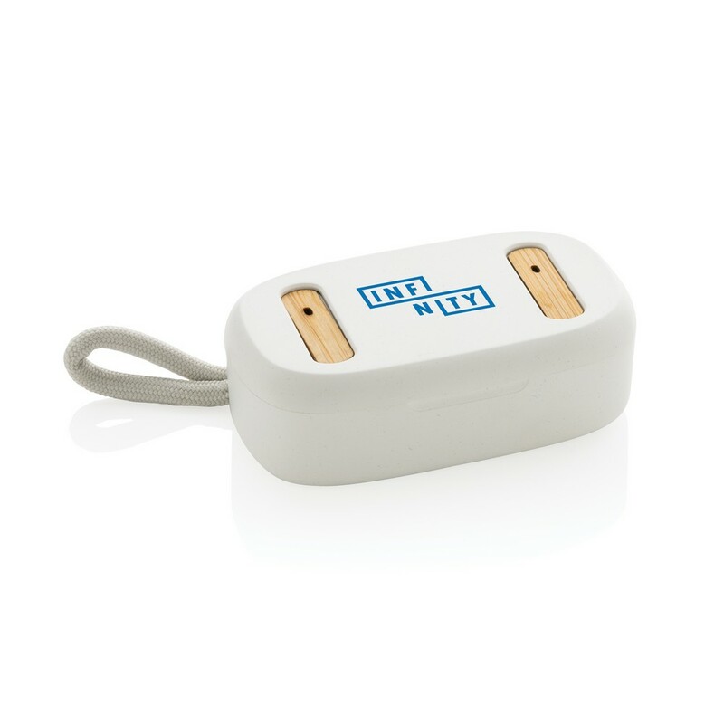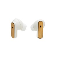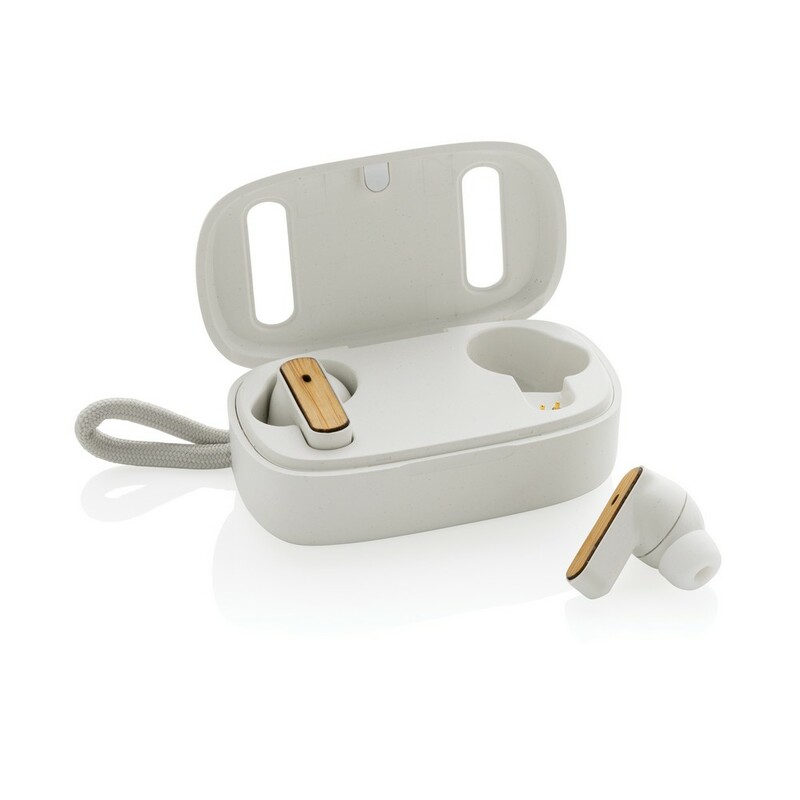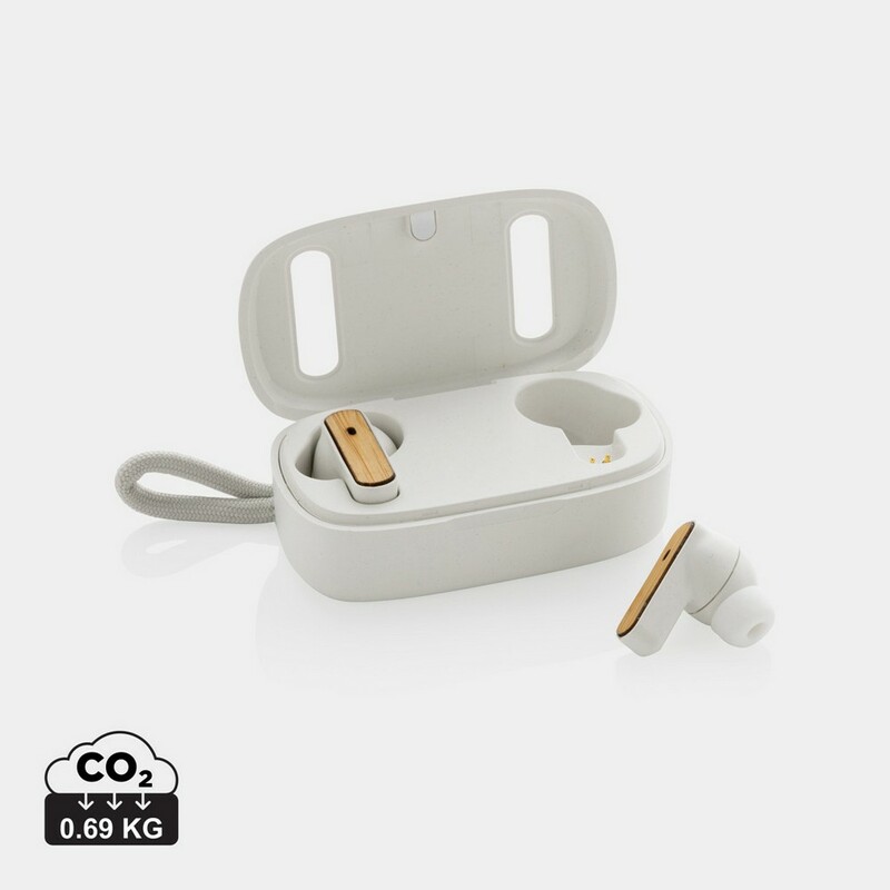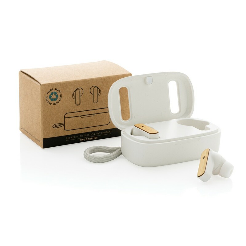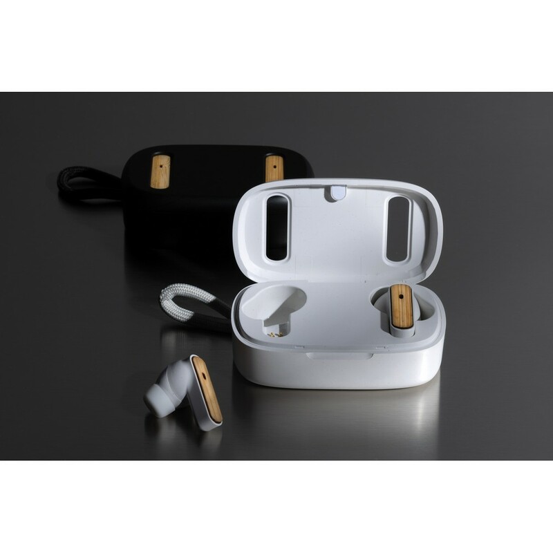 Bezprzewodowe słuchawki douszne stereo, BT 5.3, wykonane z ABS z recyklingu z certyfikatem RCS i bambusa z certyfikatem FSC® wbudowany mikrofon, funkcja odbierania połączeń, w komplecie etui z akumulatorem 400 mAh pełni funkcję stacji ładującej, akumulator słuchawek o pojemności 40 mAh umożliwia odtwarzanie muzyki na średnim poziomie głośności do 5 godzin, ponowne naładowanie za pomocą etui w 1 godzinę, zasięg do 10 m, 3 rozmiary nakładek dousznych w komplecie, nie zawiera PVC, ślad węglowy produktu: 0,69 kg CO2