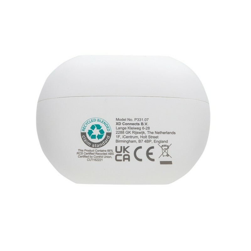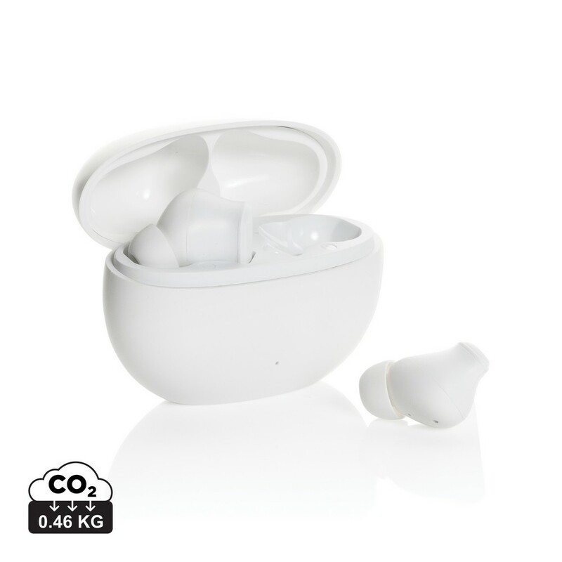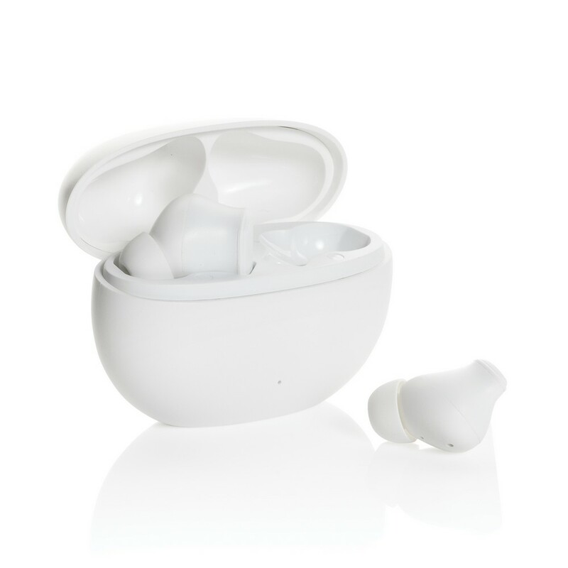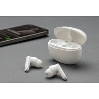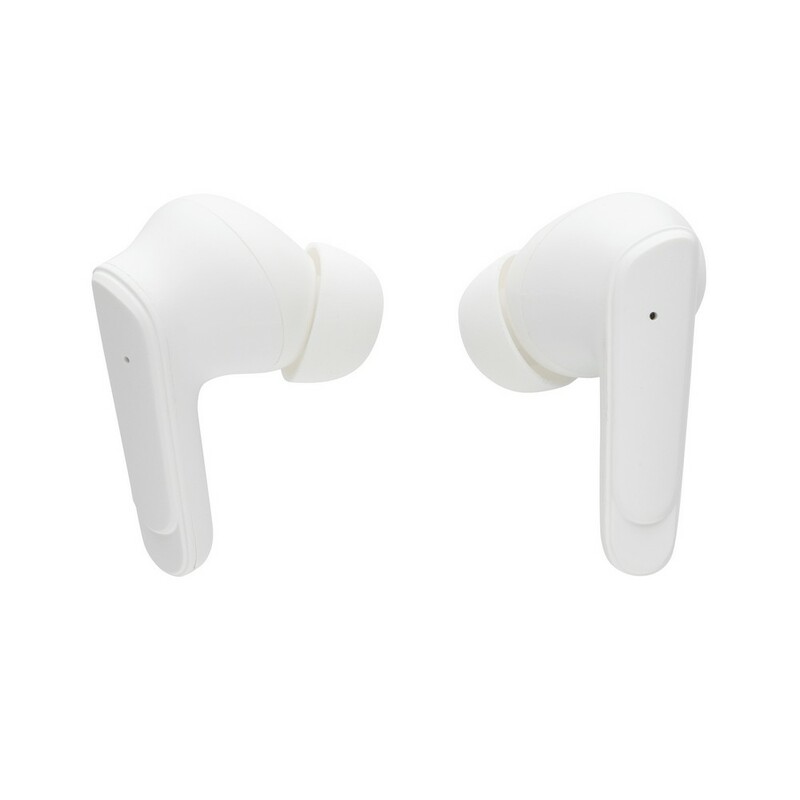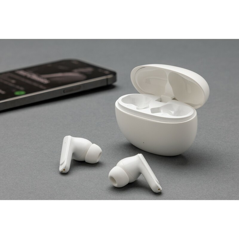 Bezprzewodowe słuchawki duszne, BT 5.3, posiadają funkcje ANC (do 23dB) i ENC, wykonane z ABS z recyklingu z certyfikatem RCS, wbudowany mikrofon, funkcja odbierania połączeń, etui z akumulatorem 200 mAh pełniące funkcję stacji ładującej w komplecie, akumulator słuchawek o pojemności 30 mAh umożliwia odtwarzanie muzyki na średnim poziomie głośności do 5 godzin z ANC lub do 7 godzin bez ANC, ponowne naładowanie za pomocą etui w 1,5 godziny, zasięg do 10 m, 3 rozmiary nakładek dousznych w komplecie, całkowita zawartość materiałów z recyklingu obliczona na podstawie wagi całkowitej produktu: 66%
