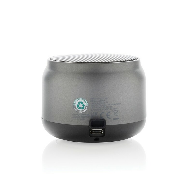 Głośnik bezprzewodowy 3W, BT 5.3, wykonany z ABS z recyklingu z certyfikatem RCS, wbudowany mikrofon, funkcja odbierania połączeń, wbudowany akumulator o pojemności 500 mAh pozwala na odtwarzanie muzyki do 4 godzin, ponowne ładowanie w 2 godziny, kabel z TPE z recyklingu w komplecie, całkowita zawartość materiałów z recyklingu obliczona w oparciu o wagę całkowitą przedmiotu: 22%, w pudełku z certyfikatem FSC® mix