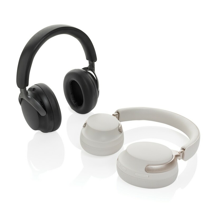 Nauszne słuchawki bezprzewodowe Soundpro ANC, wykonane z certyfikowanego plastiku z recyklingu RCS, łączność BT 5.3, składana konstrukcja, aktywna redukcja szumów na poziomie 20 dB, czas pracy do 20 godzin, pełne ładowanie w 2 godziny, zasięg działania do 10 m, wbudowany mikrofon do połączeń, kabel ładujący z certyfikatem RCS, opakowanie prezentowe FSC® mix