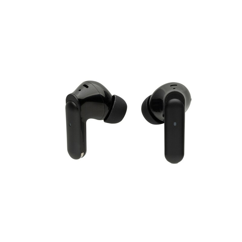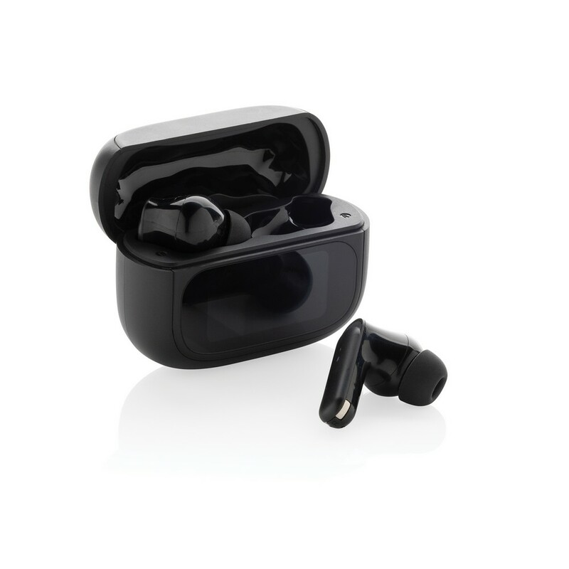 Bezprzewodowe słuchawki douszne z systemem aktywnej redukcji szumów (ANC), poziom redukcji szumów do 23 dB, BT 5.3, posiadają wbudowany ekran dotykowy TFT, który oferuje funkcje takie jak: przełączanie utworów, odbieranie połączeń, regulacja poziomu głośności i wiele innych, wodoodporne IPX4, wbudowany mikrofon, funkcja odbierania połączeń, do 6 godzin odtwarzania na jednym ładowaniu, ponowne naładowanie w etui ładującym w 1,5h, wykonane z ABS z recyklingu z certyfikatem RCS, w komplecie 3 pary nakładek w różnych rozmiarach, całkowita zawartość materiałów z recyklingu obliczona na podstawie wagi całkowitej przedmiotu: 43%, w pudełku z papieru kraftowego z certyfikatem FSC®