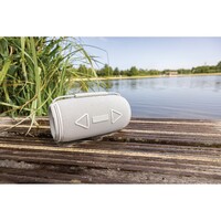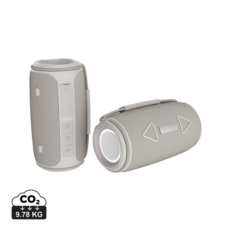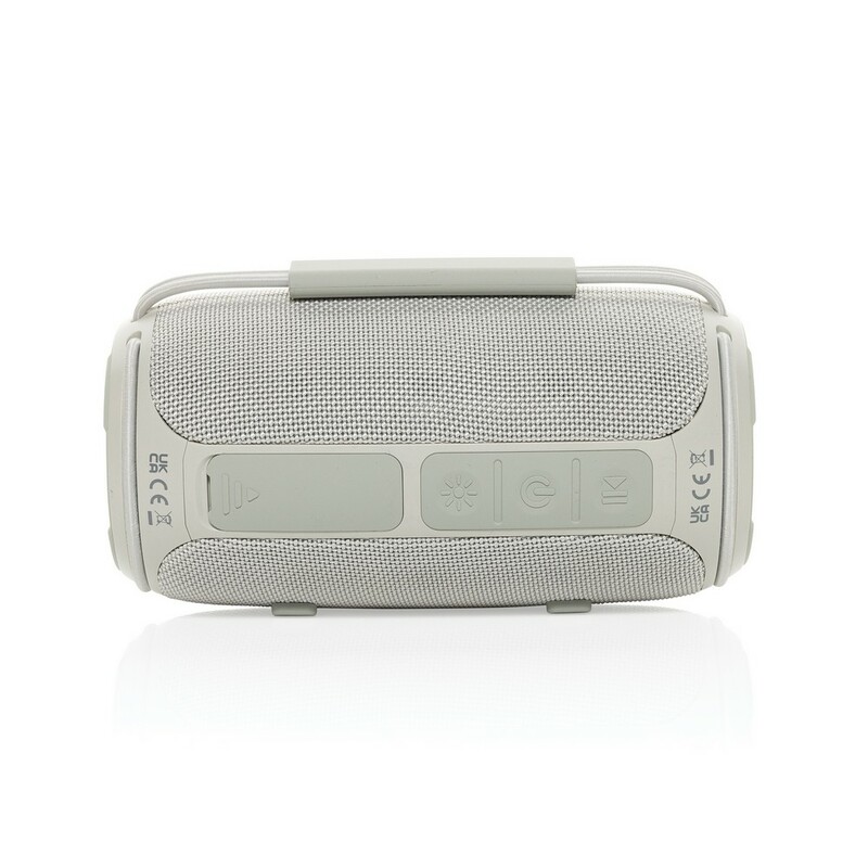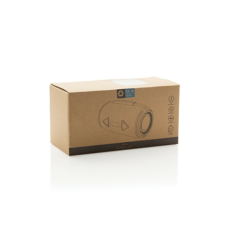 Głośnik bezprzewodowy 16W, BT 5.3, wodoodporny IPX4, wbudowany mikrofon, funkcja odbierania połączeń, posiada dwa głośniki niskotonowe, wbudowany akumulator o pojemności 1500 mAh pozwala na odtwarzanie do 7 godzin na średnim poziomie głośności, wykonany z materiałów pochodzących z recyklingu, całkowita zawartość materiałów z recyklingu obliczona na podstawie wagi całkowitej przedmiotu: 37%