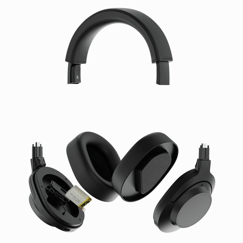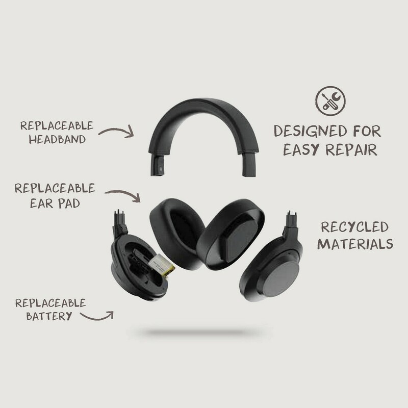 Bezprzewodowe słuchawki nauszne, dzięki specjalnej konstrukcji słuchawki można łatwo rozebrać i naprawić, wymienna bateria, pałąk oraz nauszniki, posiadają funkcje ANC i ENC, wykonane z PC z recyklingu z certyfikatem RCS, 5 wbudowanych mikrofonów dla krystalicznie czystych rozmów, funkcja asystenta głosowego, funkcja odbierania połączeń, akumulator słuchawek umożliwia odtwarzanie muzyki do 40 godzin na jednym ładowaniu, całkowita zawartość materiałów z recyklingu obliczona na podstawie wagi całkowitej produktu: 32%