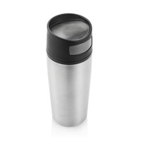 Kubek termiczny 300 ml, stal nierdzewna na zewnątrz, wnętrze z PP, szczelne wieczko z przyciskiem z boku, nie wymaga obsługi oburącz, utrzymuje temperaturę napojów gorących do 4 godzin, wzór zastrzeżony®