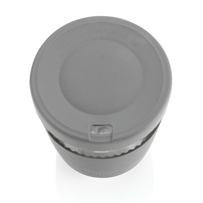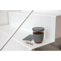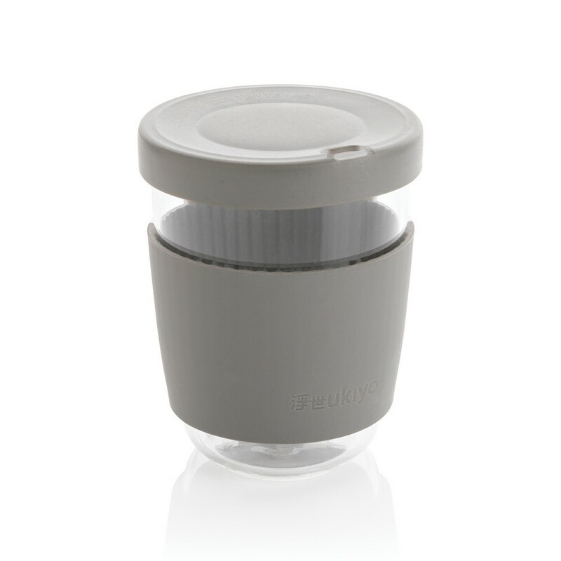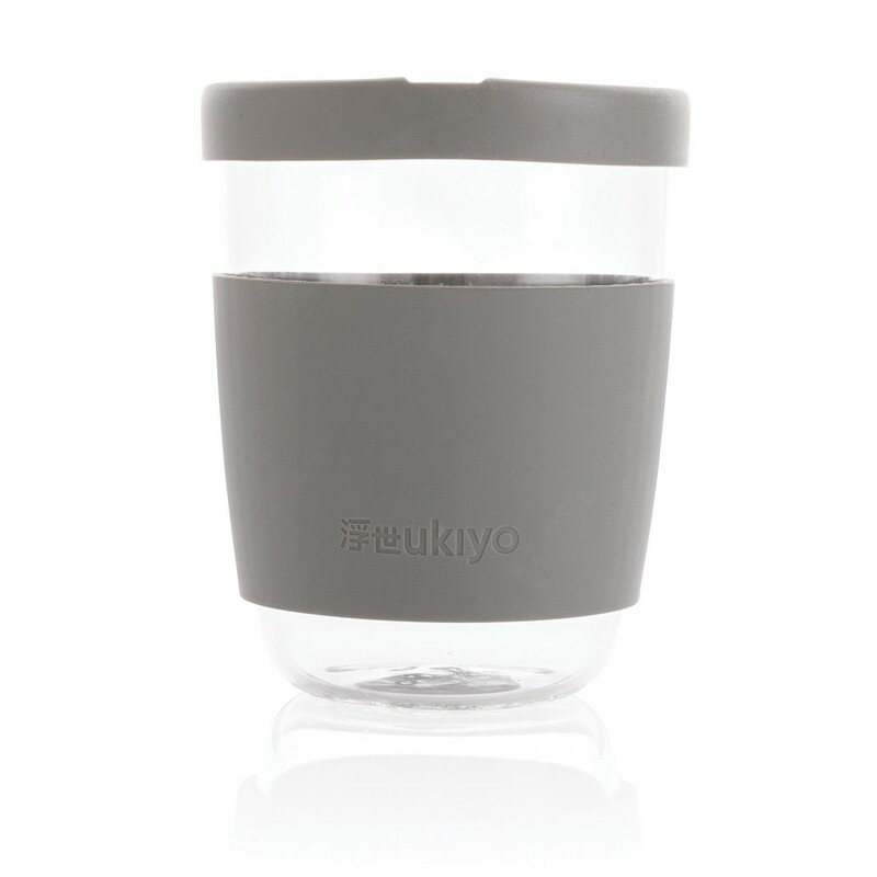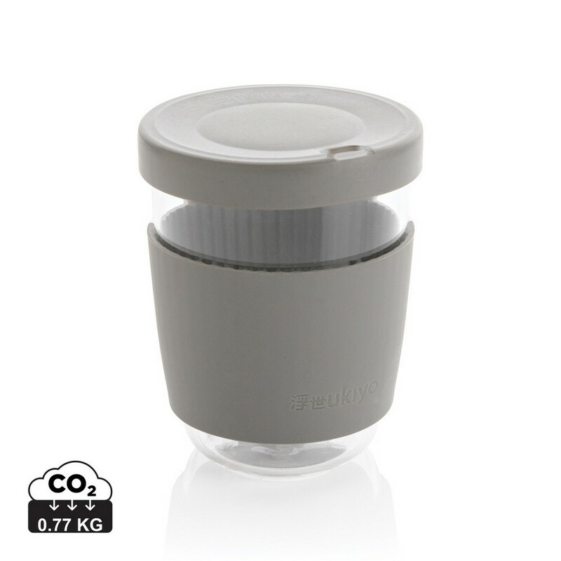 Szklany kubek podróżny Ukiyo 360 ml, wykonany ze szkła borokrzemowego, silikonowy uchwyt, wieczko z otworem zapobiegającym zbieraniu się ciśnienia, ślad węglowy produktu: 0,77 kg CO2