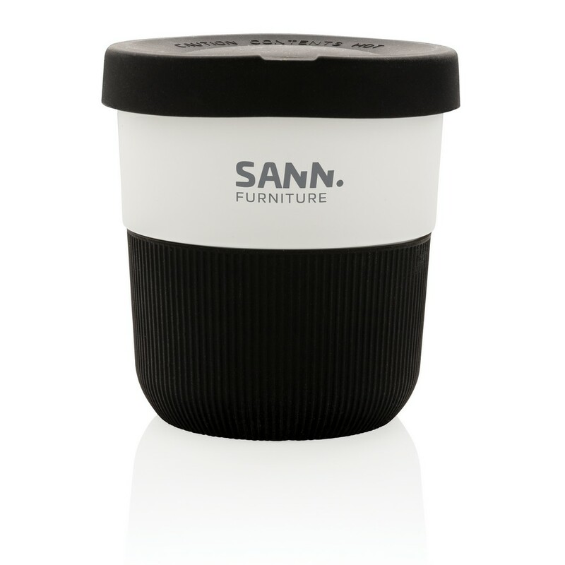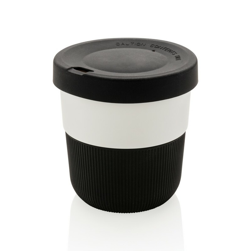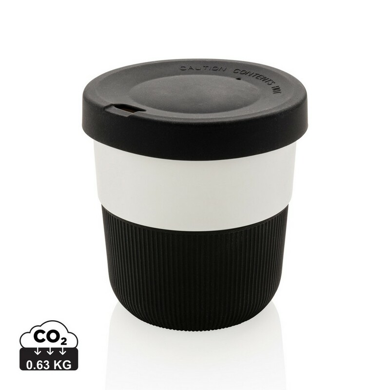 Kubek podróżny 250 ml, wykonany z PLA, silikonowe wieczko i uchwyt, pasuje do większości ekspresów do kawy, nie zawiera melaminy, ślad węglowy produktu: 0,63 kg CO2