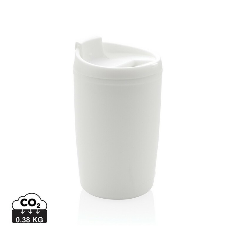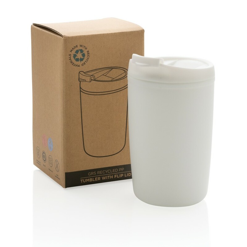 Kubek podróżny 300 ml, nie wymaga obsługi oburącz, wykonany z PP z recyklingu z certyfikatem GRS (Global Recycled Standard) który gwarantuje, że wykorzystane materiały pochodzą z recyklingu, całkowita zawartość materiału z recyklingu obliczona w oparciu o wagę całkowitą przedmiotu: 96%, można myć w zmywarce i używać w kuchence mikrofalowej, w pudełku z papieru kraftowego z certyfikatem FSC® (Forest Stewardship Council), ślad węglowy produktu: 0,38 kg CO2